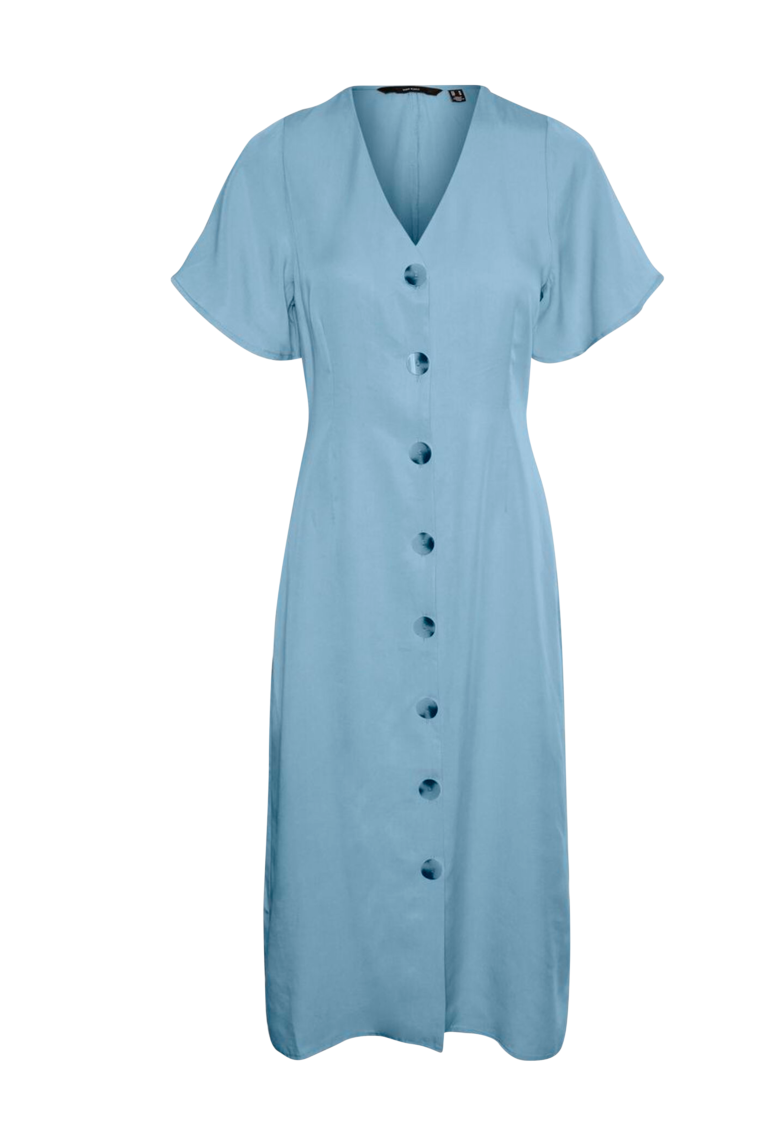 Kjole i figurformet modell med V-utringet hals og knapping med store knapper hele veien foran. Lengde ca. 115 cm i str S.