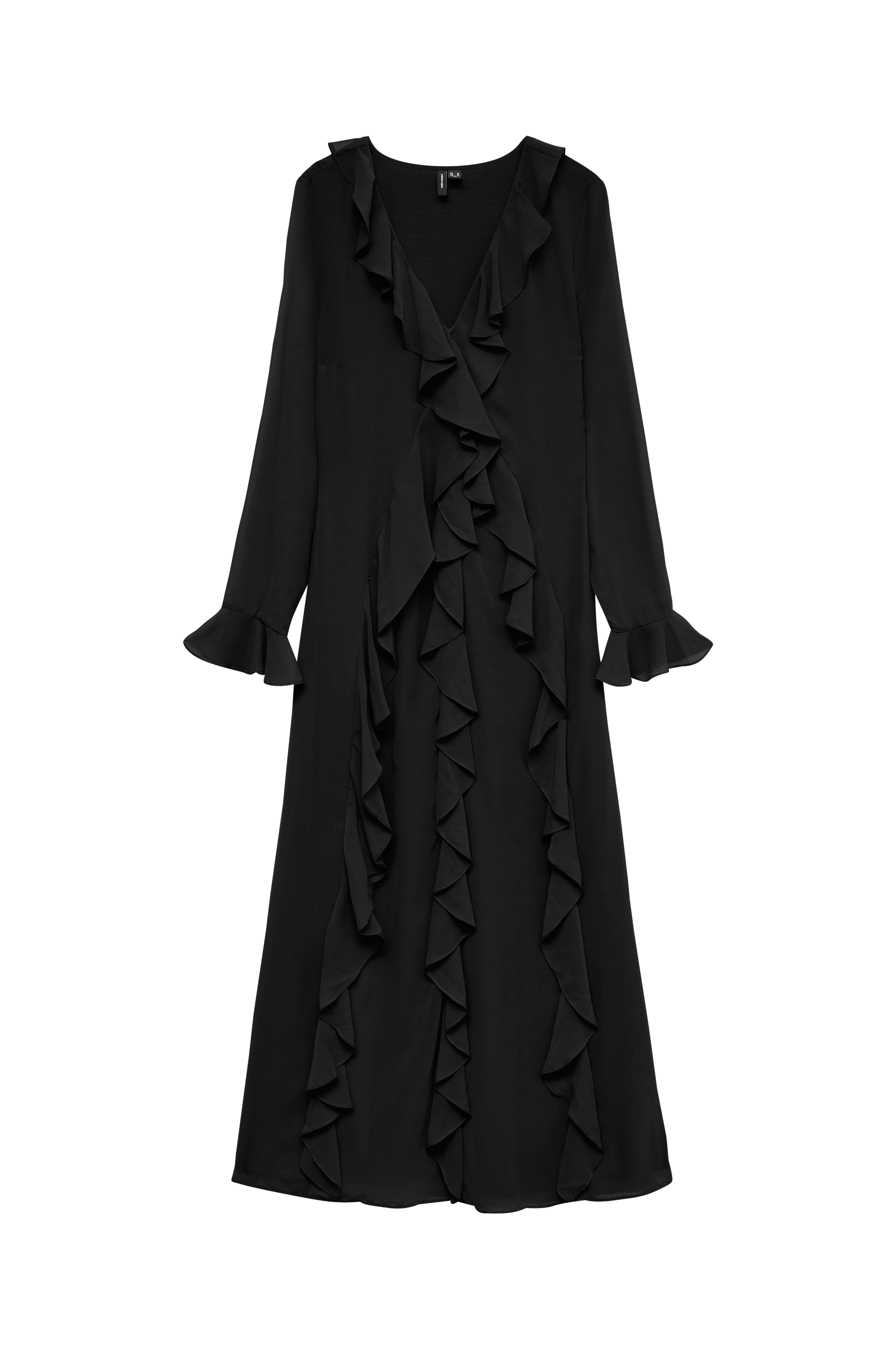 • Fôret kjole i chiffon• V-formet hals• Dekorative volangdetaljer overalt• Lange, halvtransparente ermer med volang i ermeslutten• Litt utsvinget modell• Lengde: 137 cm i størrelse S