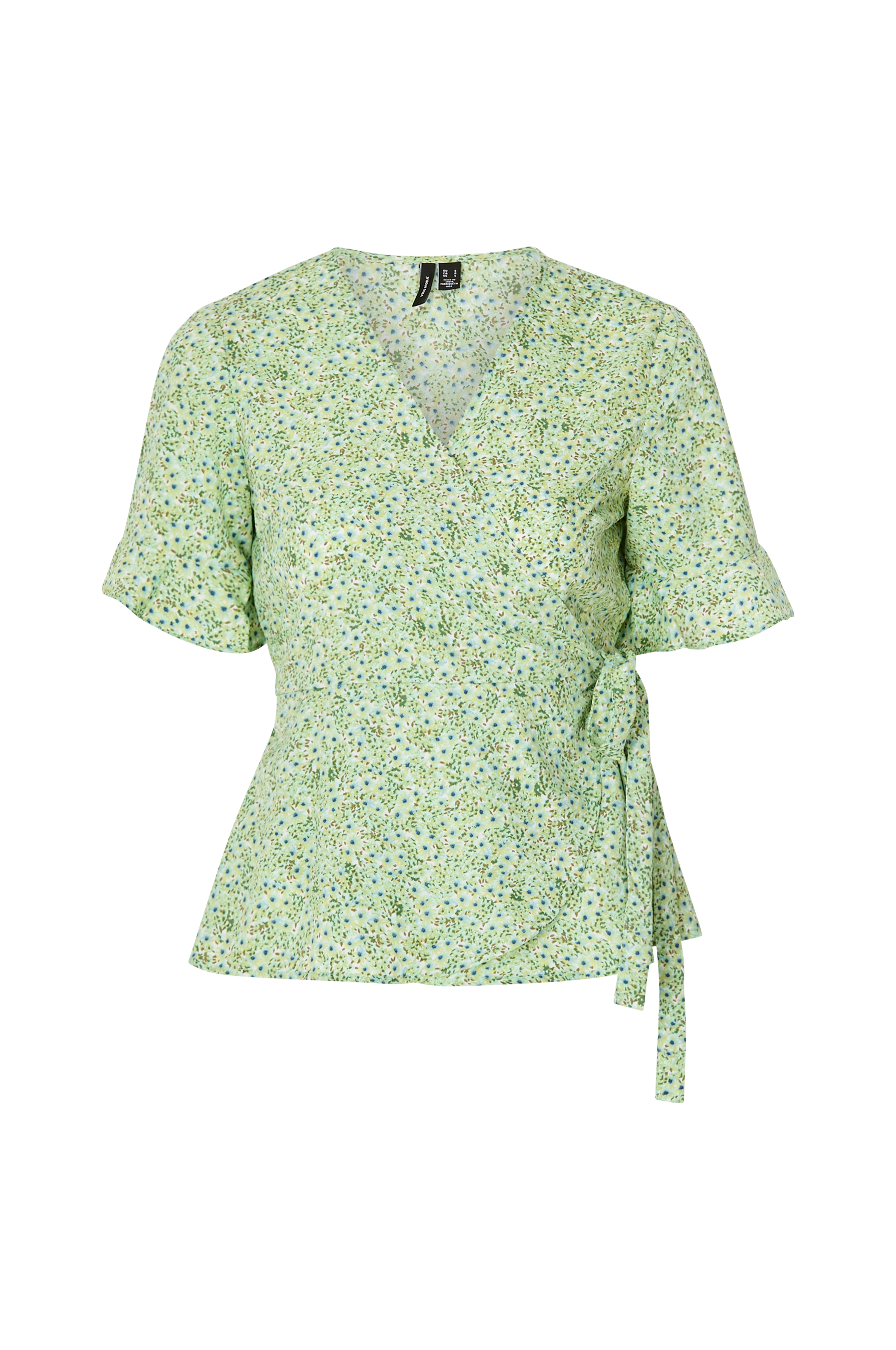 Omslagsbluse med knyting i den ene siden. Korte ermer med volang i ermekantene. Fremstilt i tynn, vevd kvalitet.