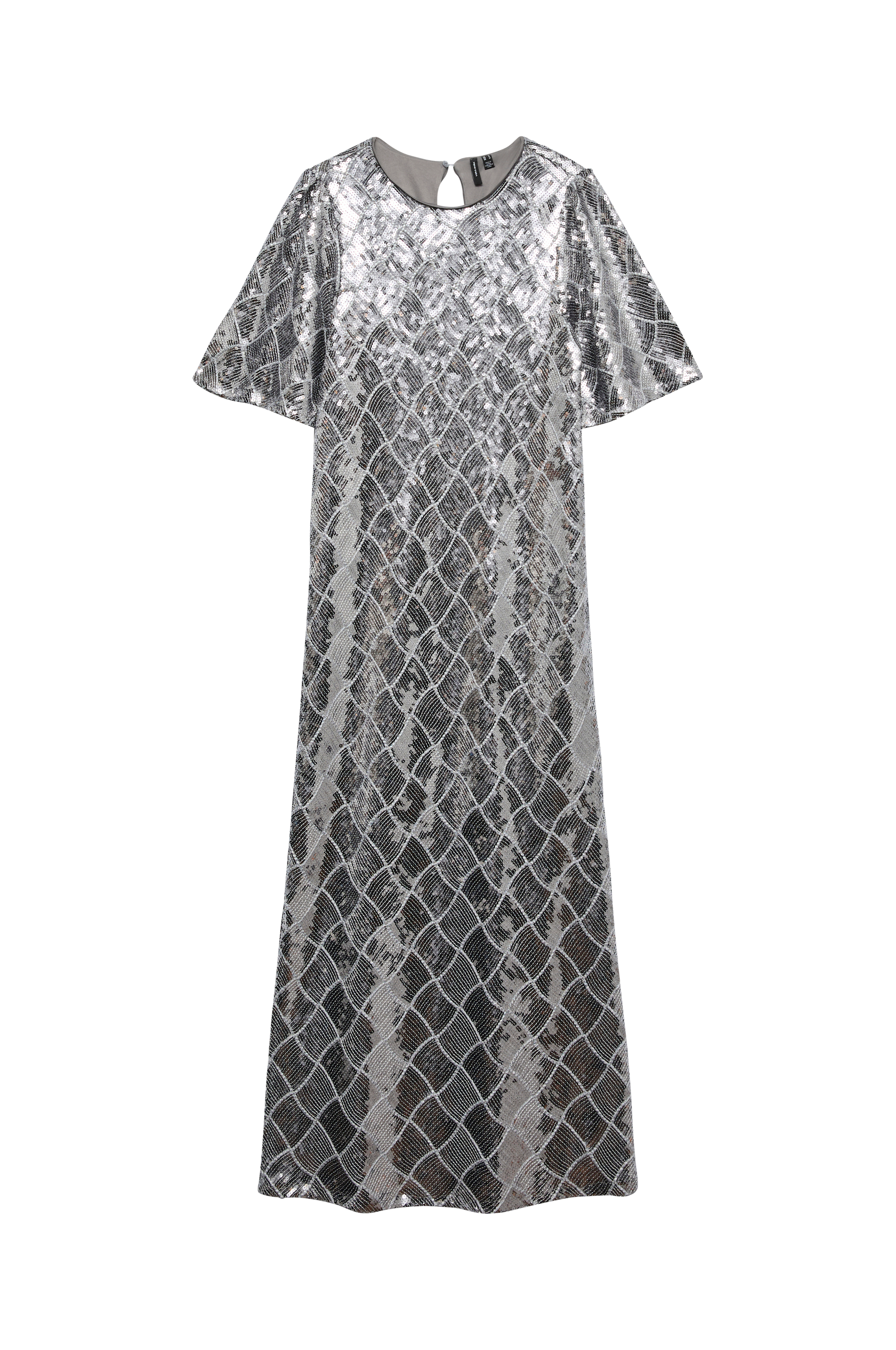 • Lang, fôret kjole med skimrende paljetter• Rund hals• Skjær med knapp i nakken• Korte ermer• Splitt nede i sidene• Ettersittende passform• Lengde: 127 cm i størrelse S