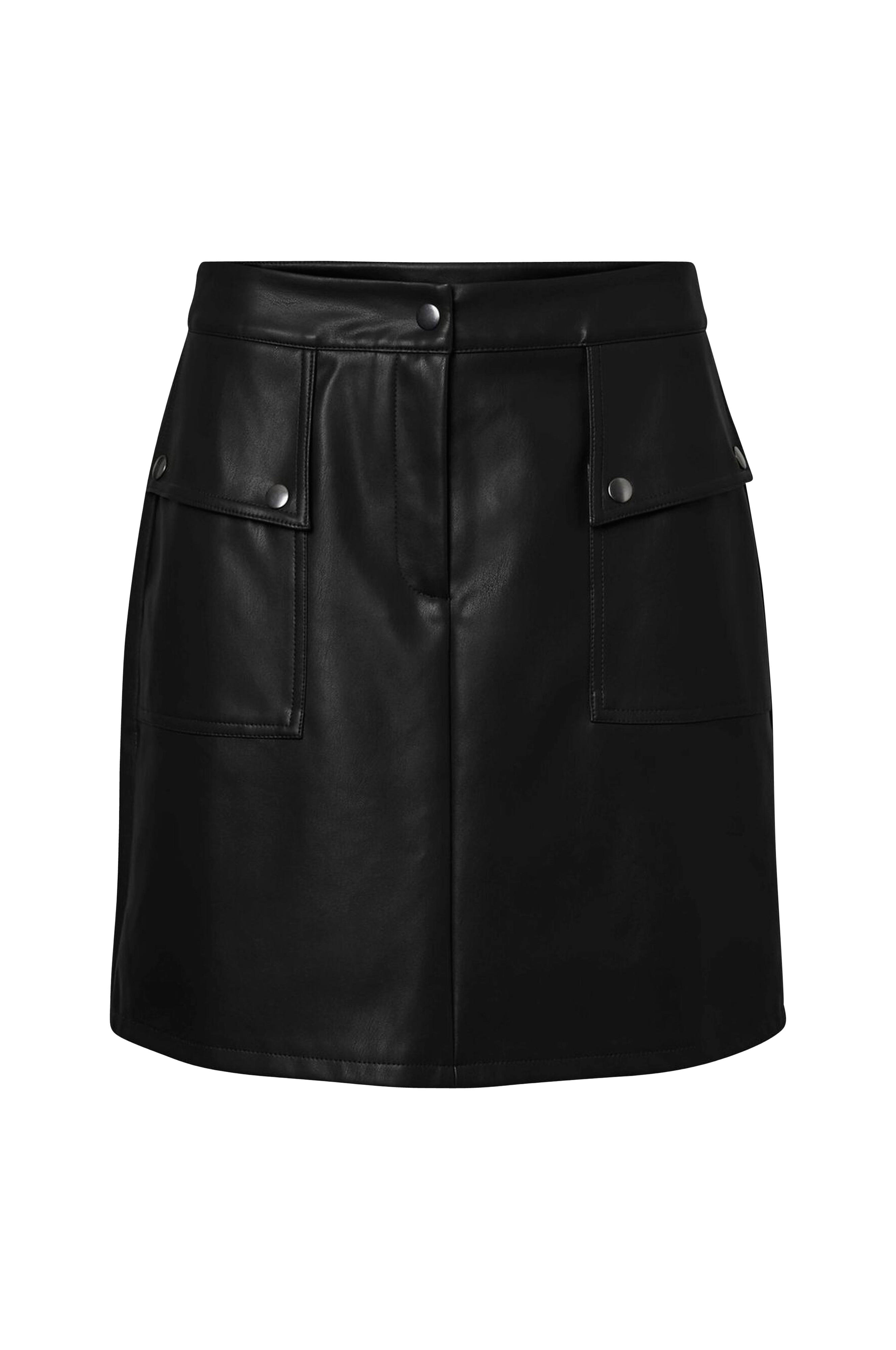 Skjørt vmPaulina H/W Short Skirt fra Vero Moda. Lett utsvingt modell i skinnimitasjon med to påsydde forlommer som har lommeklaff og trykknapper. Påsydd linning med trykknapp og glidelås i gylfen. Lengde ca. 47 cm i str S.