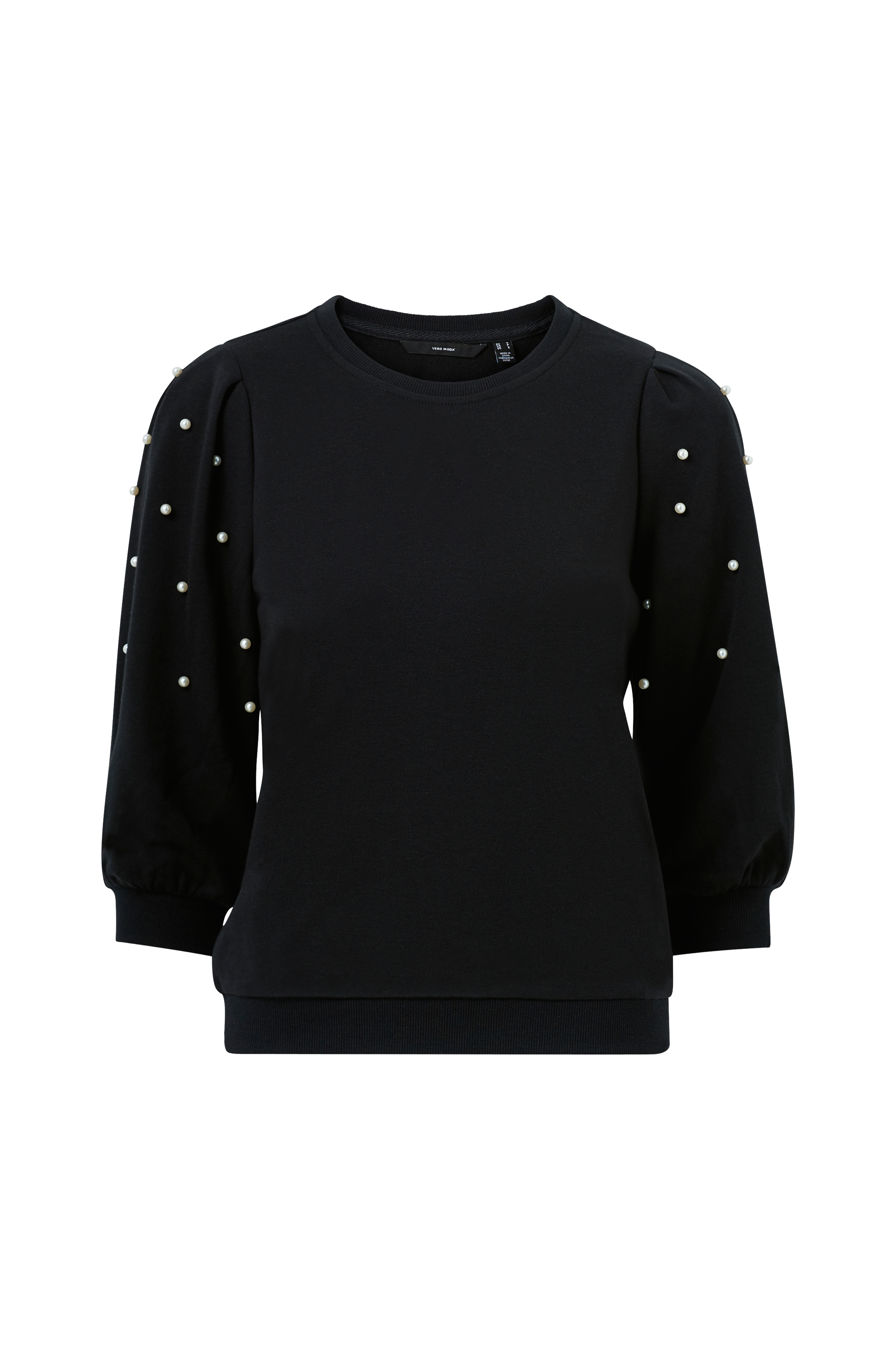 Topp vmBeckie 3/4 Oneck Sweatshirt fra Vero Moda. Rett modell med ledig snitt og rette, vide ermer med rynker ved skuldrene, broderte perler øverst og vrangbord i ermekantene. Også vrangbord rundt hals og nederkant.