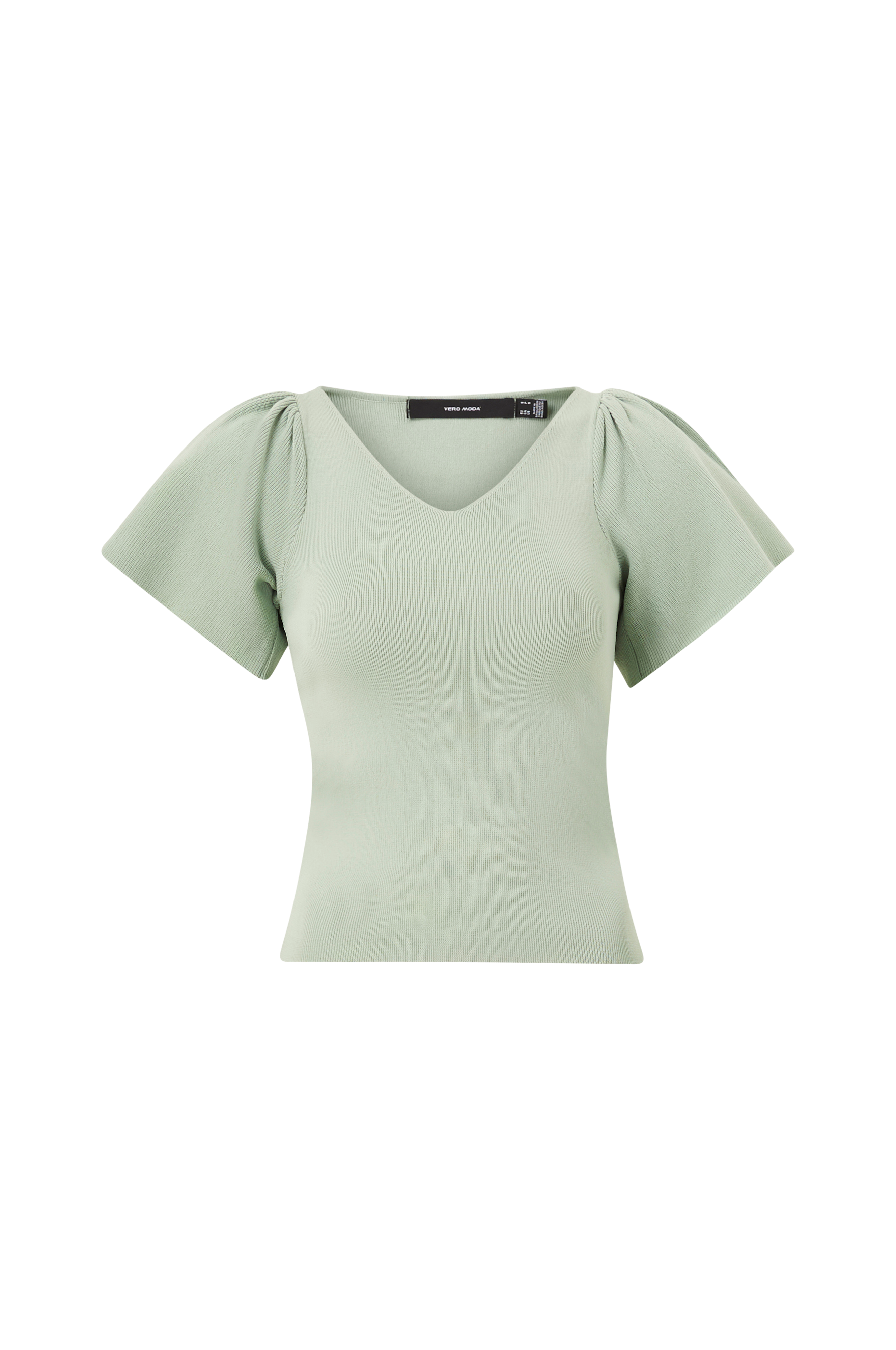 • Ettersittende topp i jerseystoff• V-hals snitt• Korte, brede armer• Rysje på skuldrene