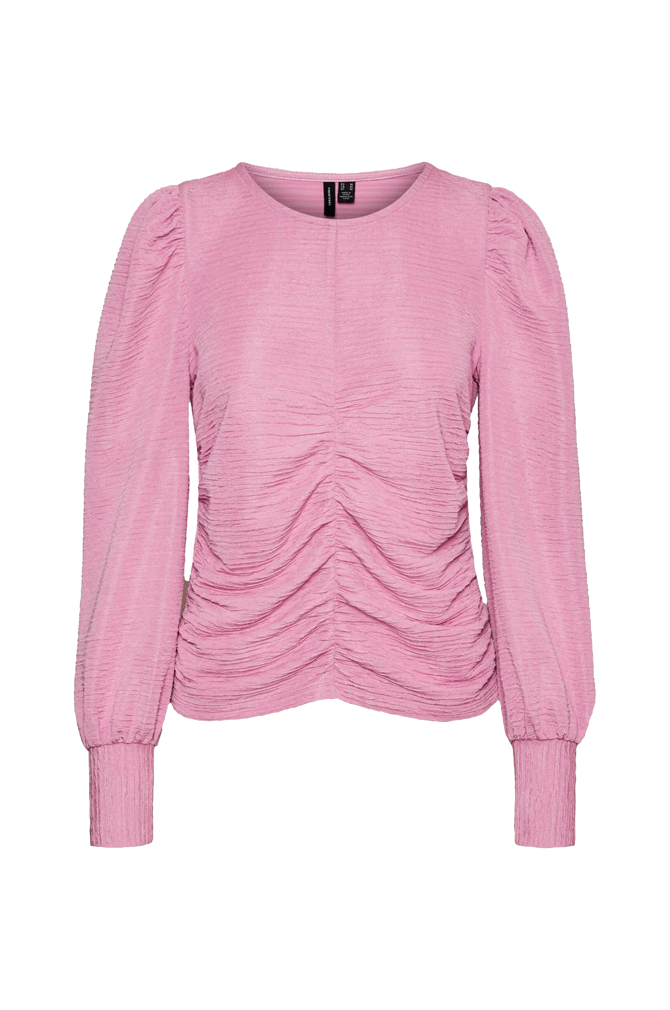 Figurmønstret topp i teksturmønstret jersey med strikkdrapering foran og i sidene. Rund hals med smal fald og vide puffermer med rynker ved skuldrene og mansjett i ermekantene.