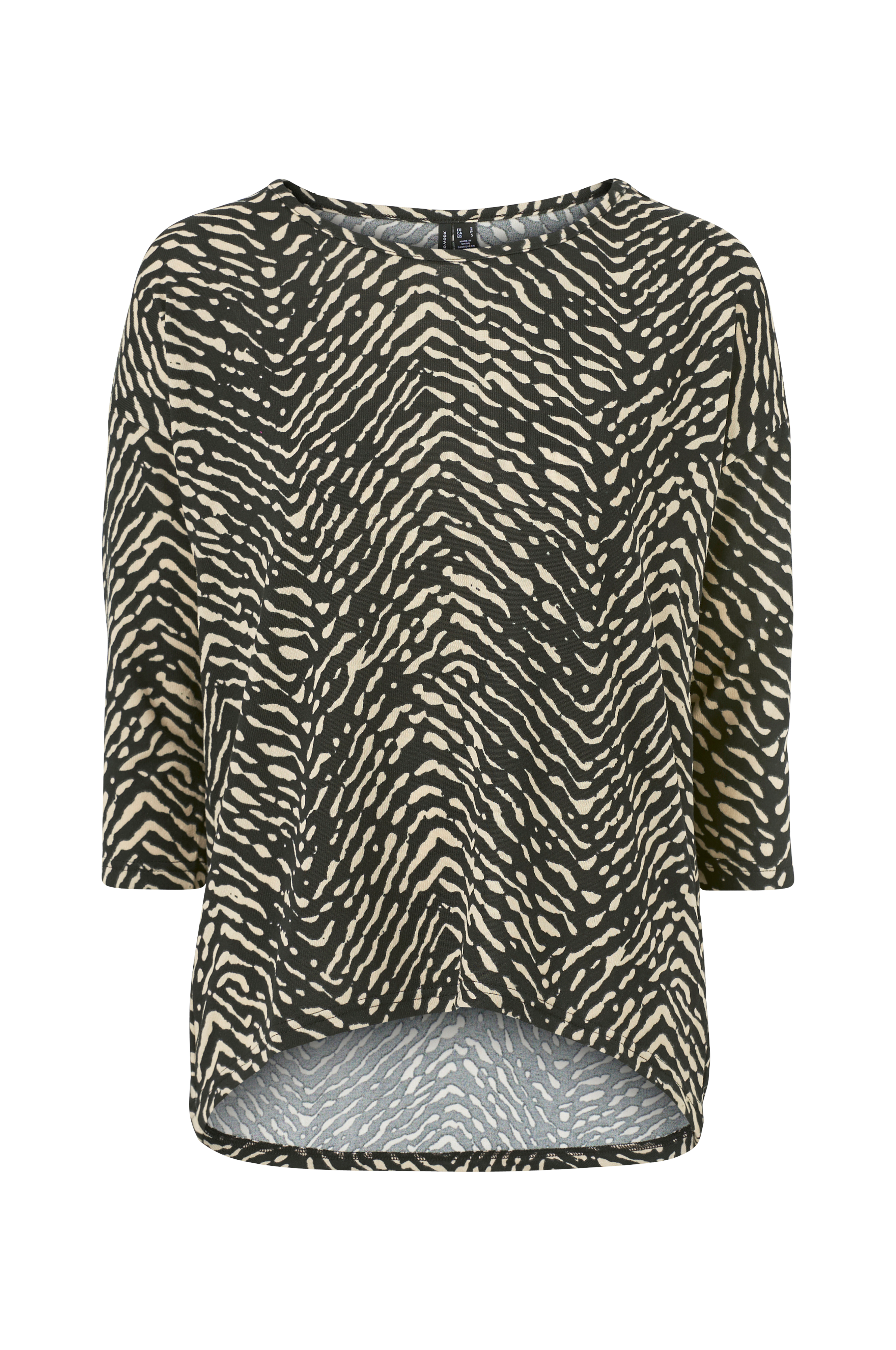 Topp i elastisk trikot med rund hals og ermer i 3/4-lengde. Lenger bak med avrundet nederkant.