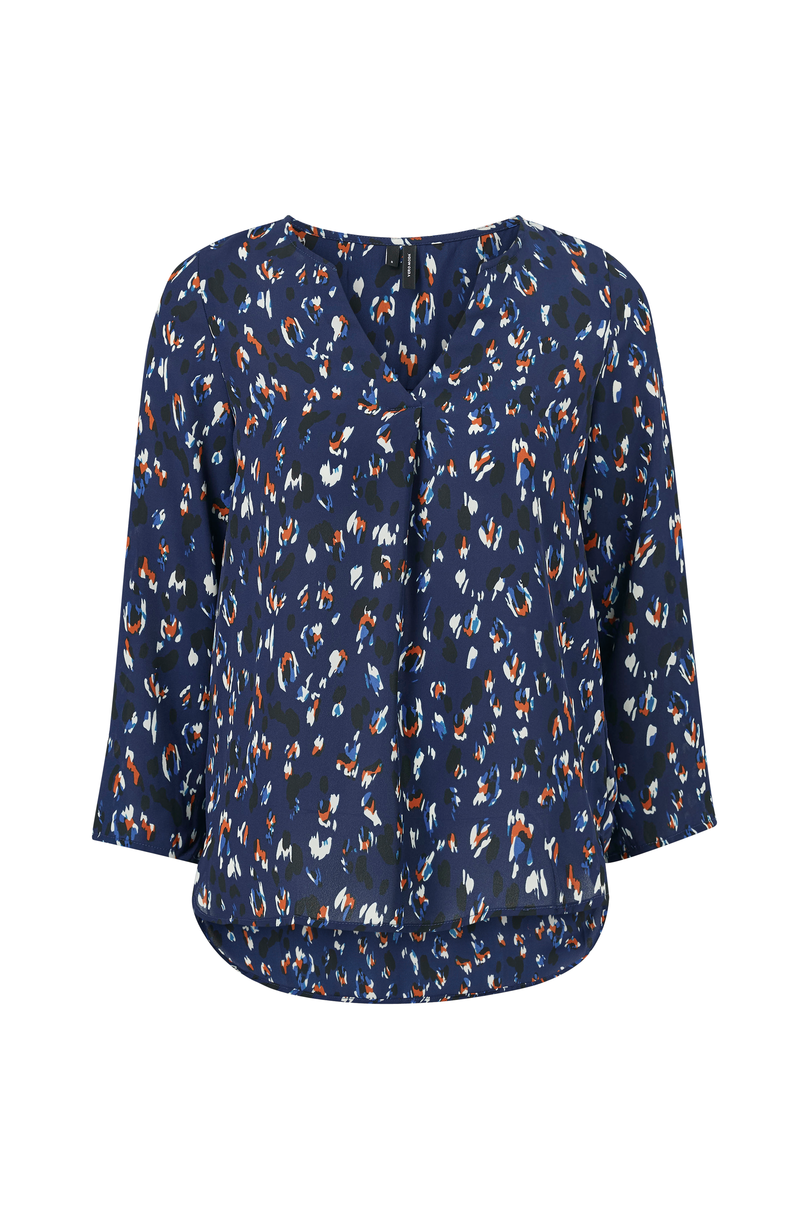 Topp vmSabby Zigga 7/8 Top fra Vero Moda. Rett modell med rund hals som har smal fald og V-utringning foran med lagte legg under. Rette ermer i 7/8-dels lengde, og rundskåret nederkant som er lenger bak. Vevd chiffon med trykt mønster.