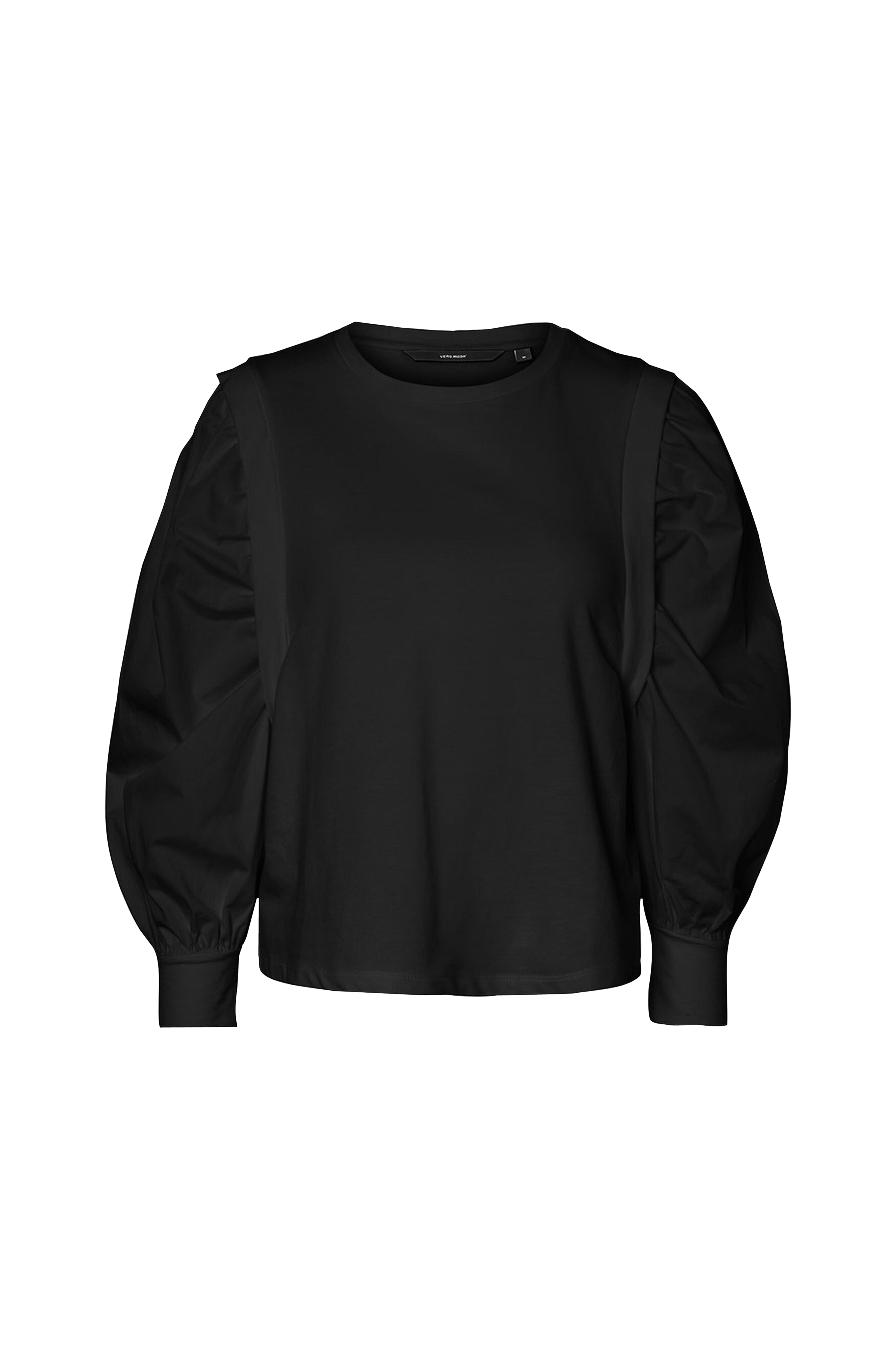 Topp vmVicki L/S Top fra Vero Moda. Rett modell i sweatshirtkvalitet med ledig passform og lagt legg over skuldrene. Lange, vide puffermer i vevd kvalitet med rynker ved skuldrene og påsydd vrangbord i ermekantene.