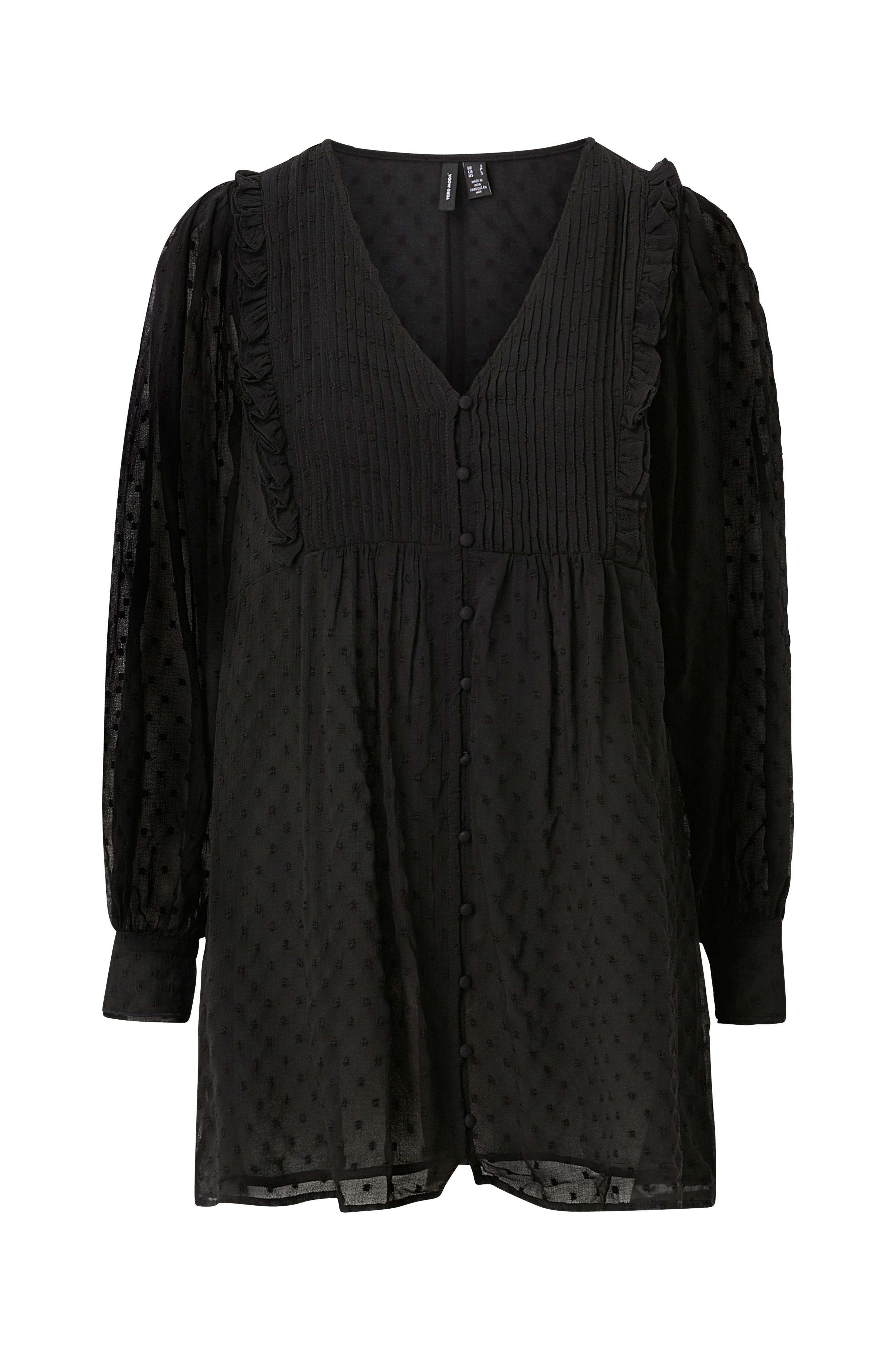 Tunika vmDea Frill L/S Tunic fra Vero Moda. Utsvingt modell i chiffon med vevde strukturprikker. Sydde strålegg over brystet med volanger ved sidene og V-utringet hals. Vide puffermer med rynker ved skuldrene og mansjett i ermekantene, samt løkkeknapping med kledde knapper hele veien foran. fôret. Lengde ca. 82 cm i str. S.