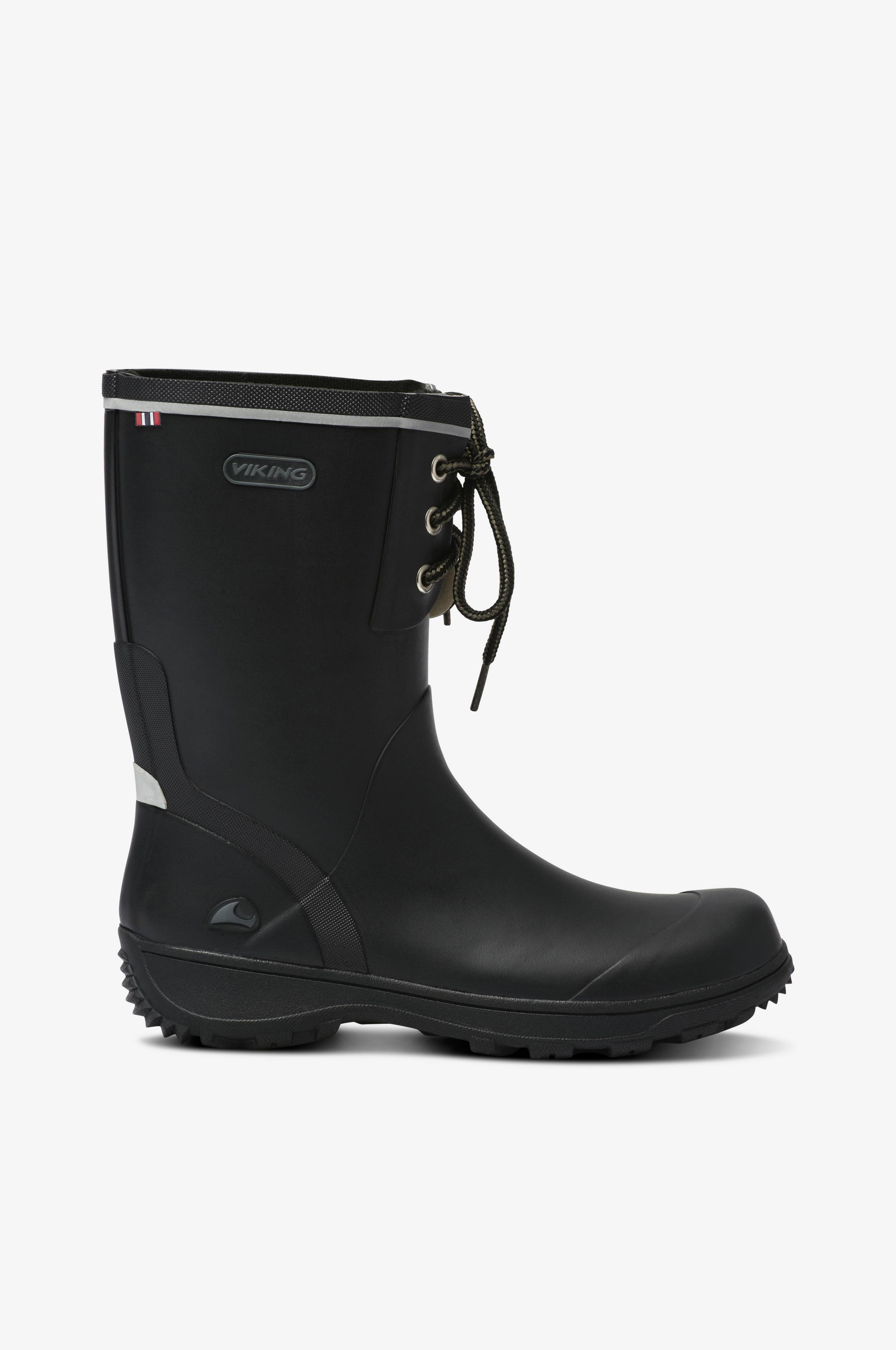 Gummistøvler i vanntett naturgummi. Justerbar snøring foran på skaftet og forsterket tåhette. Uttagbar innersåle. Hurtigtørkende tekstilfôr. Refleksdetaljer bak og rundt skaftet. Helstøpt non-marking yttersåle.