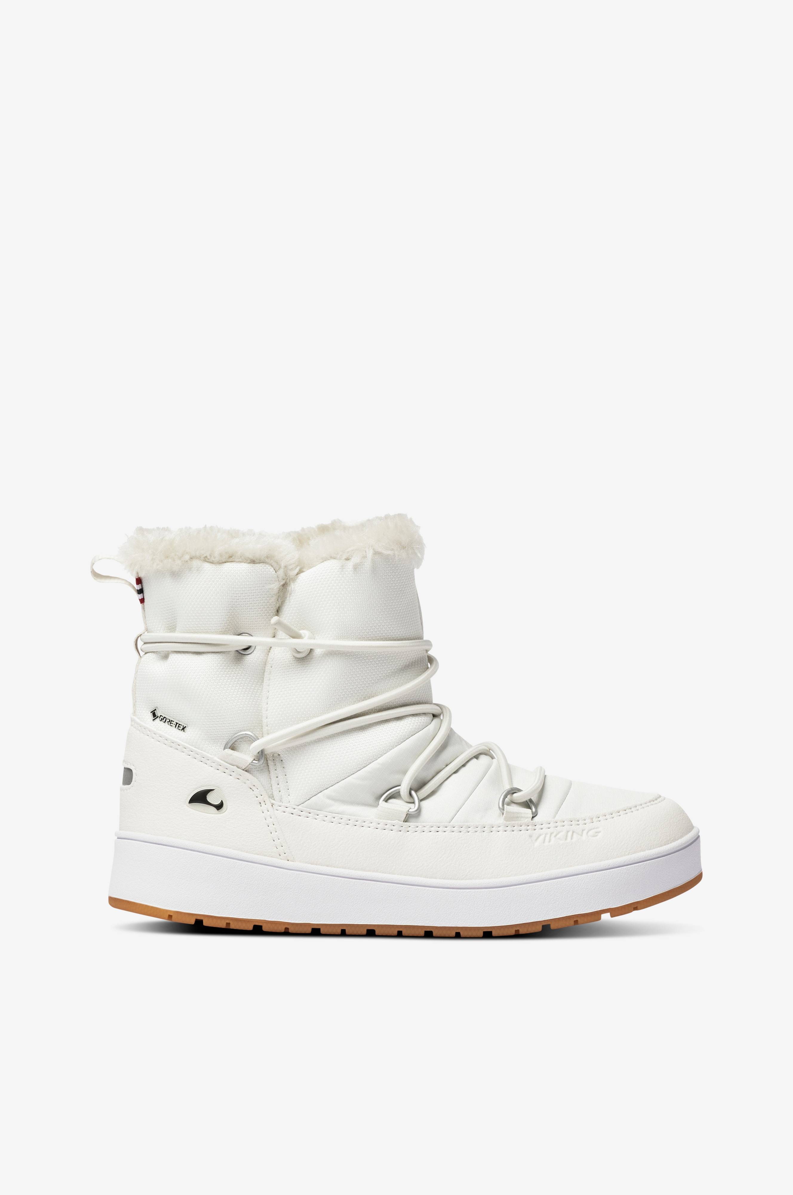 Vinterstøvler Snofnugg GTX fra Viking, moderne støvler i Slip on-modell med overdel i tekstil og syntet. Varmfôrede i myk fuskepels. GORE-TEX®-membran gjør skoene helt vanntette samtidig som de puster. Elastisk snøring gjør det lett å justere passformen. Vevd drahempe bak på skaftet. Yttersåle i gummi som gir godt grep i snøen. Refleksdetaljer. Kan vaskes i maskin på 30°.