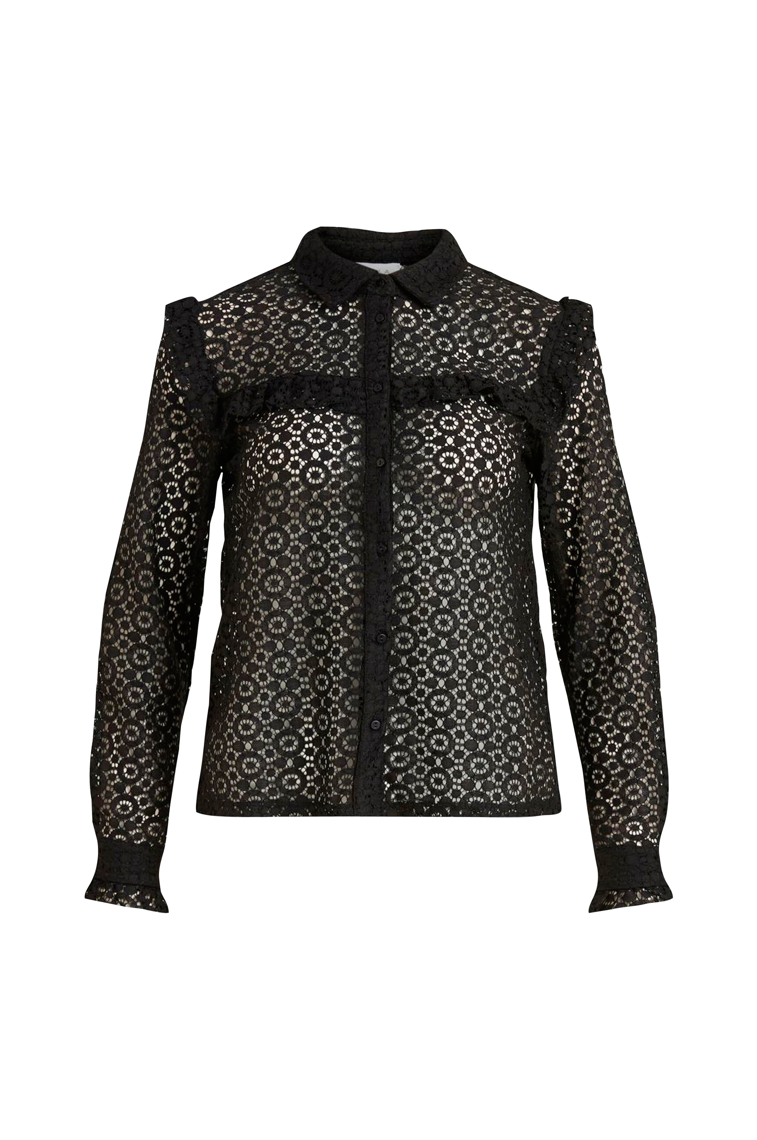 Bluse i gjennombrutt, vevd blonde med volang ved bysten og på skuldrene. Knapper foran og lange ermer med mansjett med knapp i ermekantene.