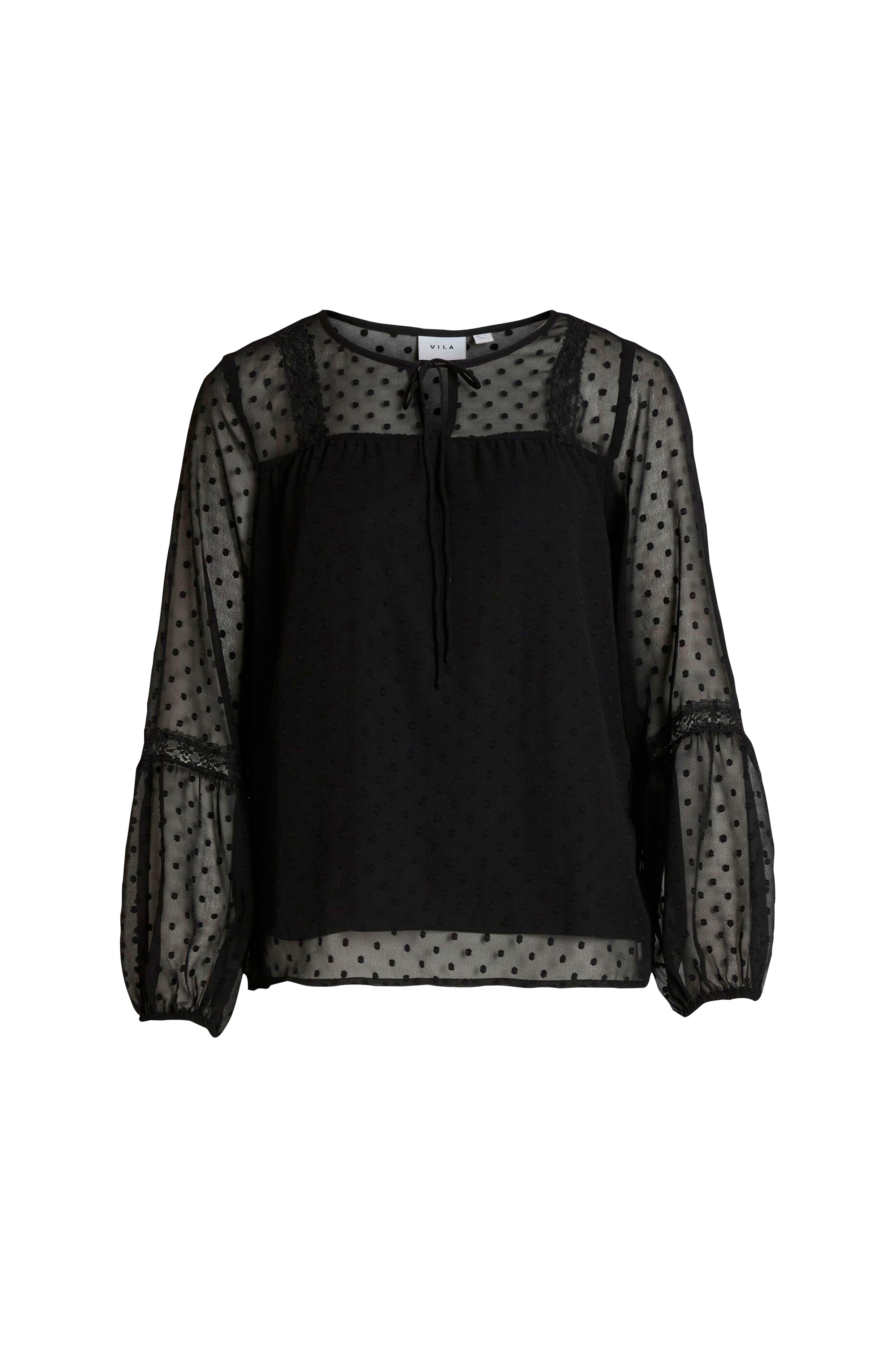 - Bluse i chiffon med teksturmønster- Knytebånd i halsen- Transparente ballongermer med blonde- Trikotfôr- Produktet inneholder gjenvunnet materiale som er brukt for å redusere mengden avfall, samtidig som det ikke er brukt nye ressurser.