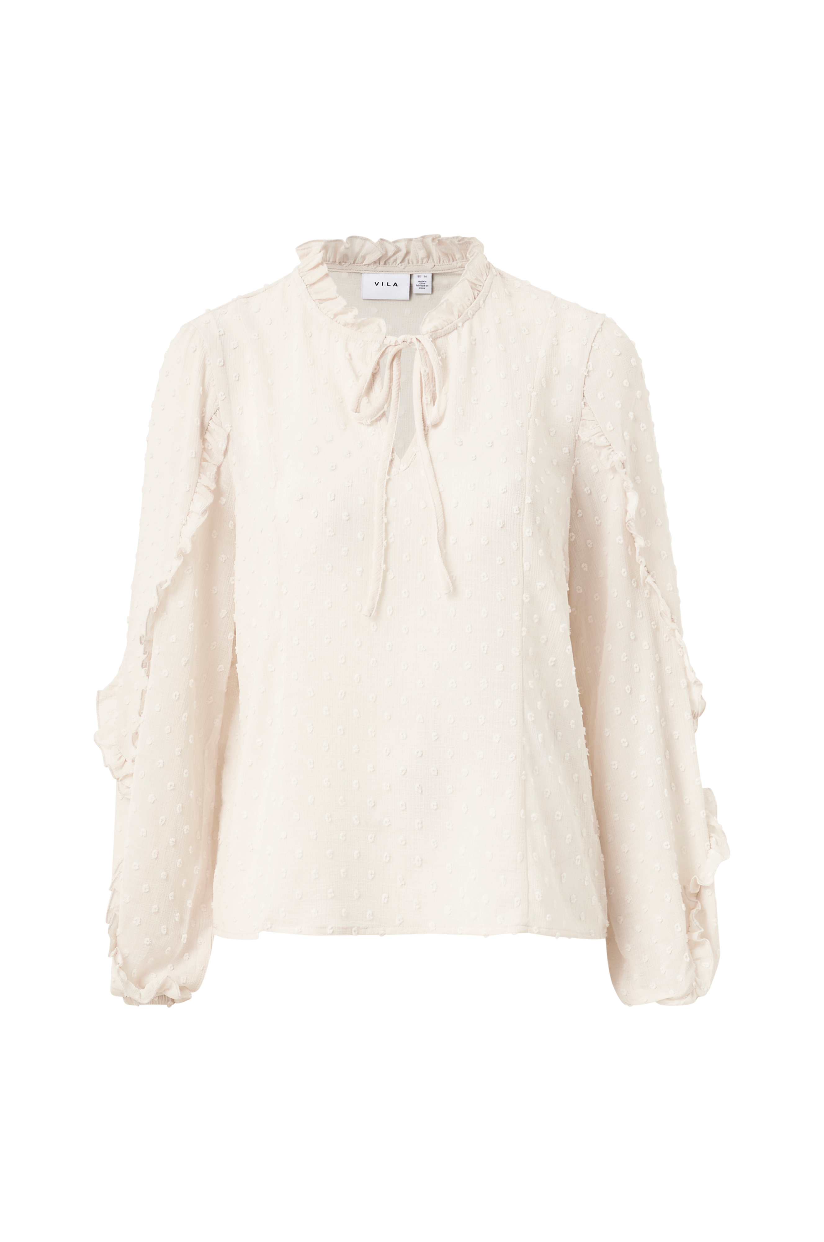 • Rett, strukturmønstret modell • Volang i halsen med knyting foran • Lang, bred arm med volanger og elastisk mansjett • Produktet inneholder gjenvunnet materiale som er brukt for å redusere mengden avfall, samtidig som det ikke er brukt nye ressurser.