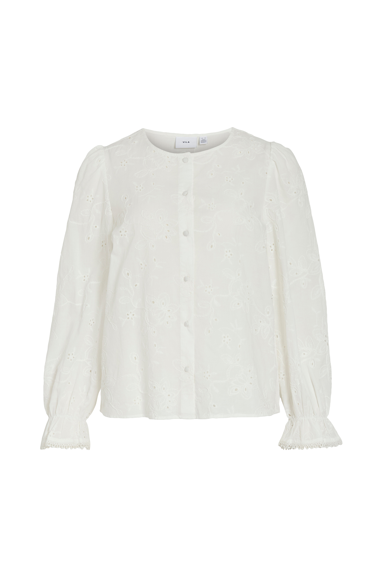 • Bluse med dekorative broderi rundt• Rund hals• Kledde knapper foran• Lange puffermer med elastiske ermeender