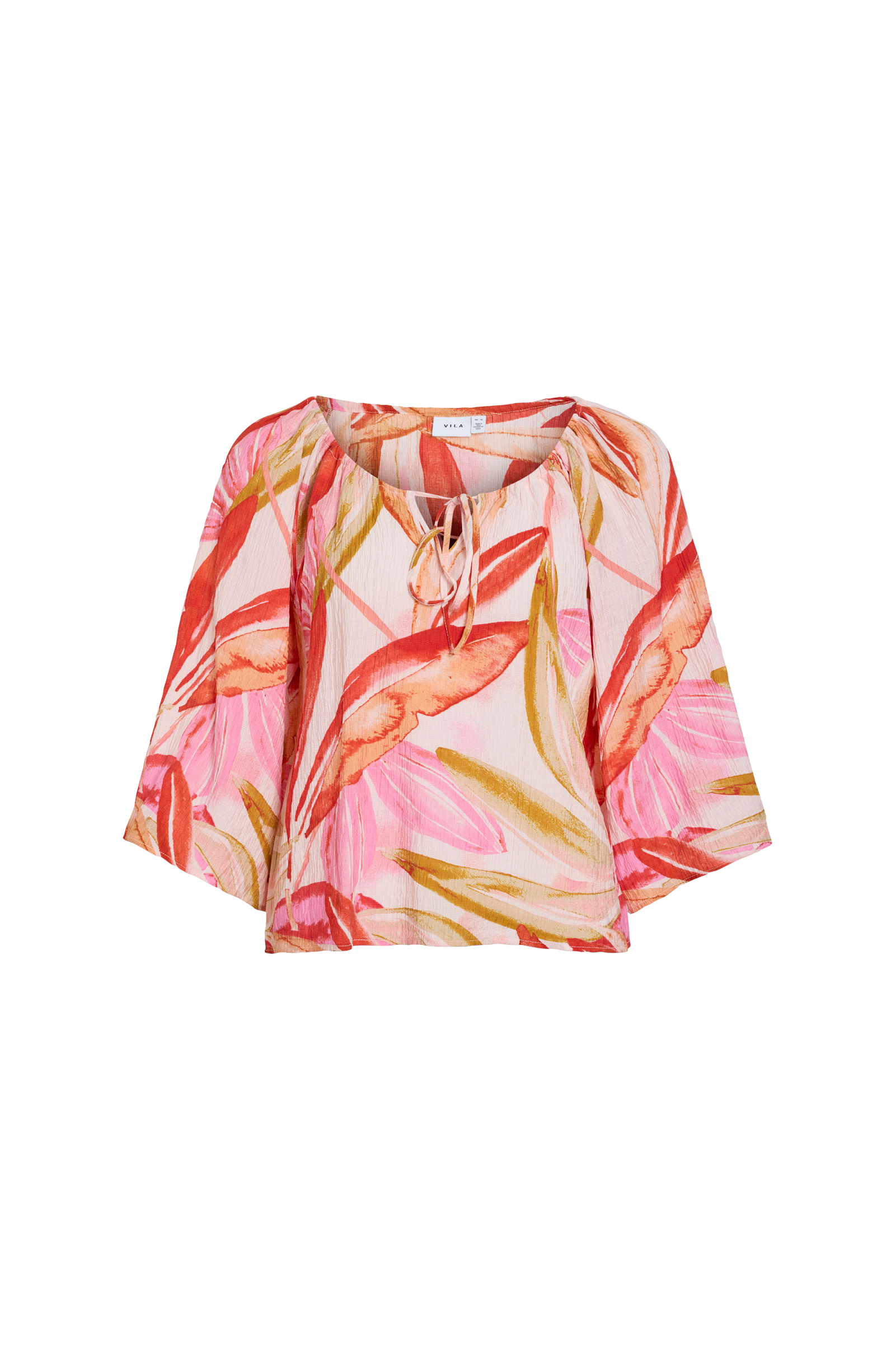 • Bluse i rynket materiale• Avrundet, bred, justerbar hals med snøring• Ermer 3/4 lang