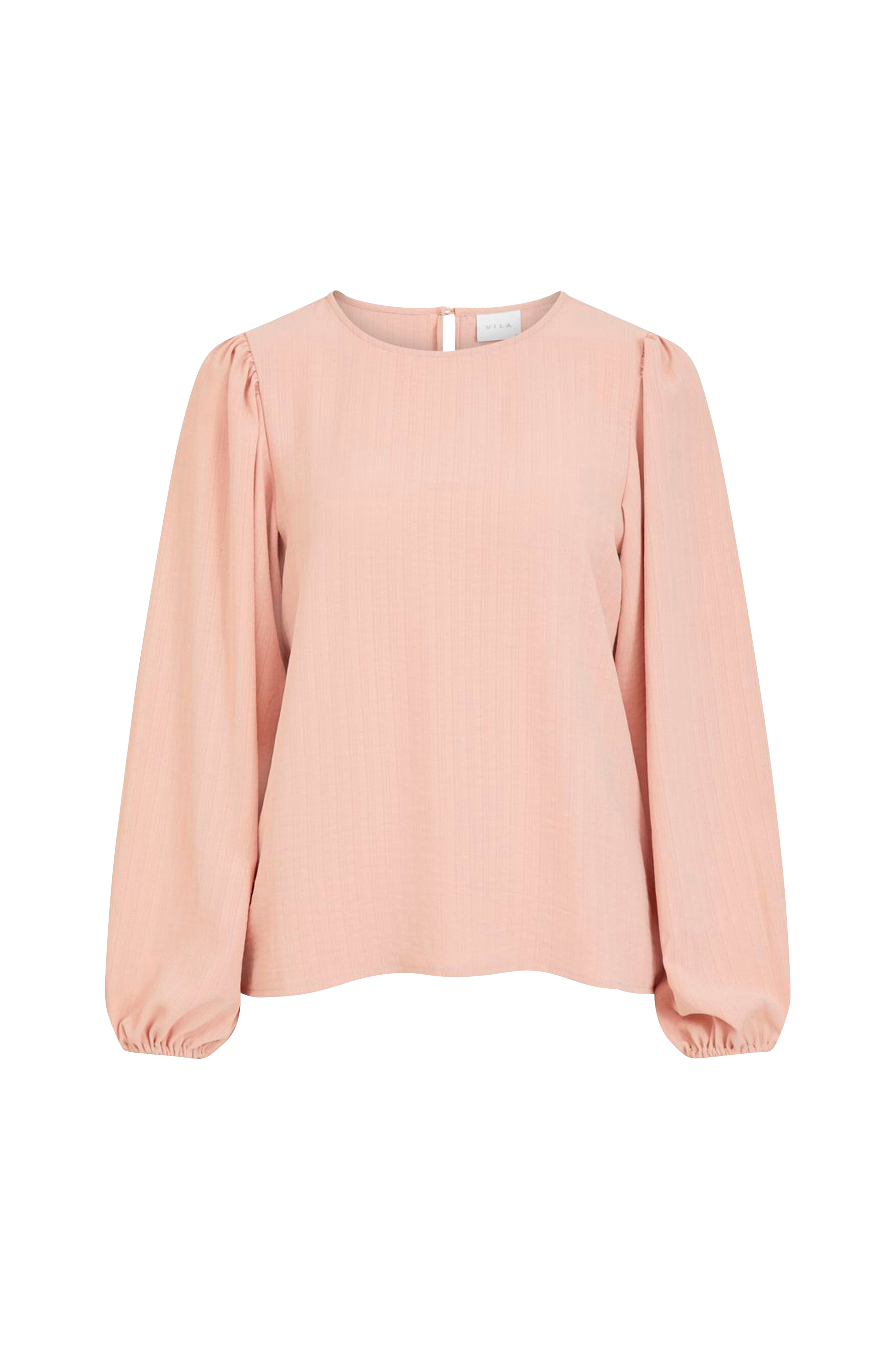 Bluse i tynn, vevd kvalitet med lett stretch og diskre striper. Lange, voluminøse ballongermer med elastiske ermekanter og puff på skuldrene. Rund hals med splitt og kledd knapp i nakken.