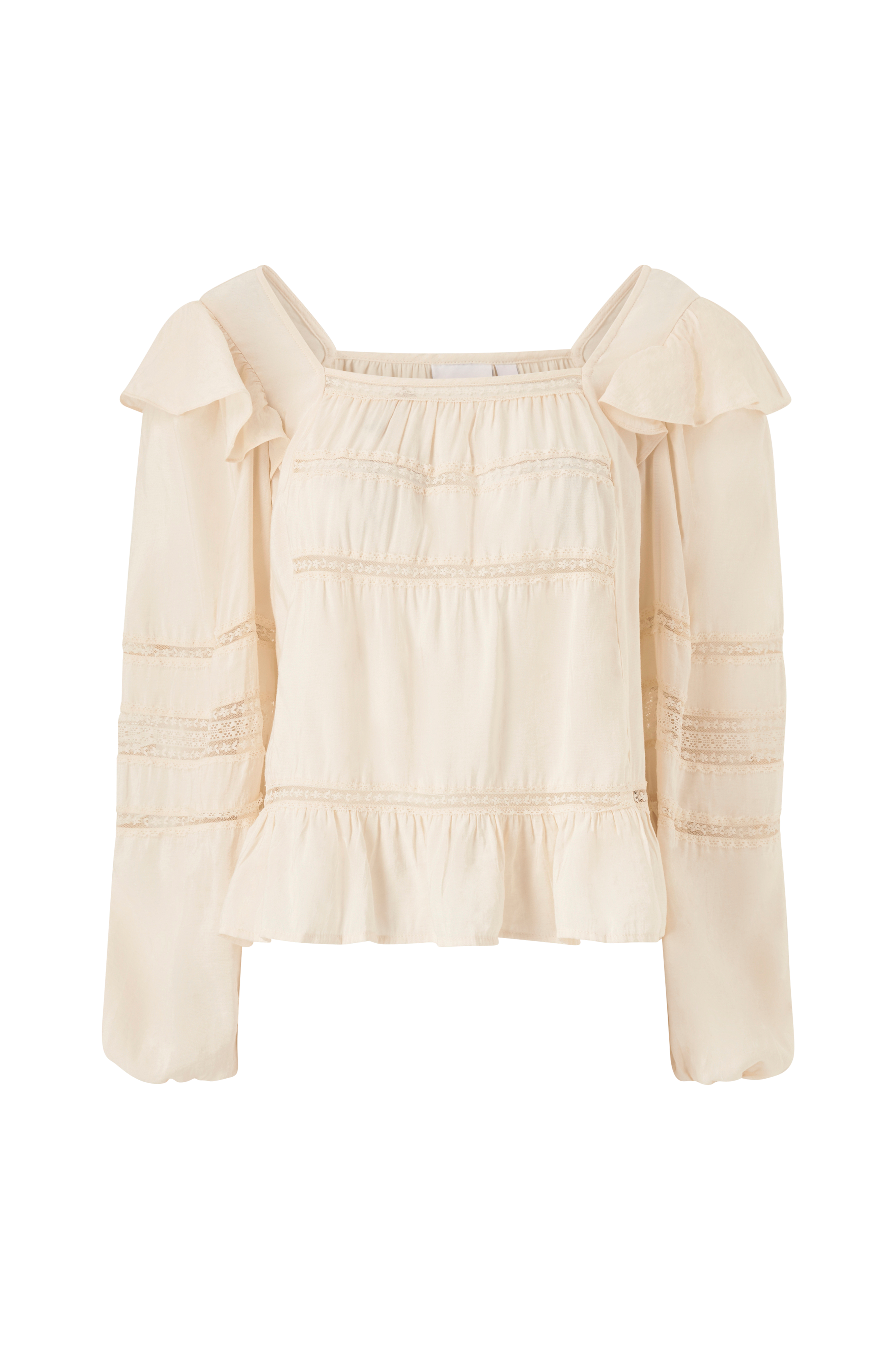 • Romantisk bluse med blondedetaljer• Firkantet hals• Volanger på skuldrene• Ballongermer