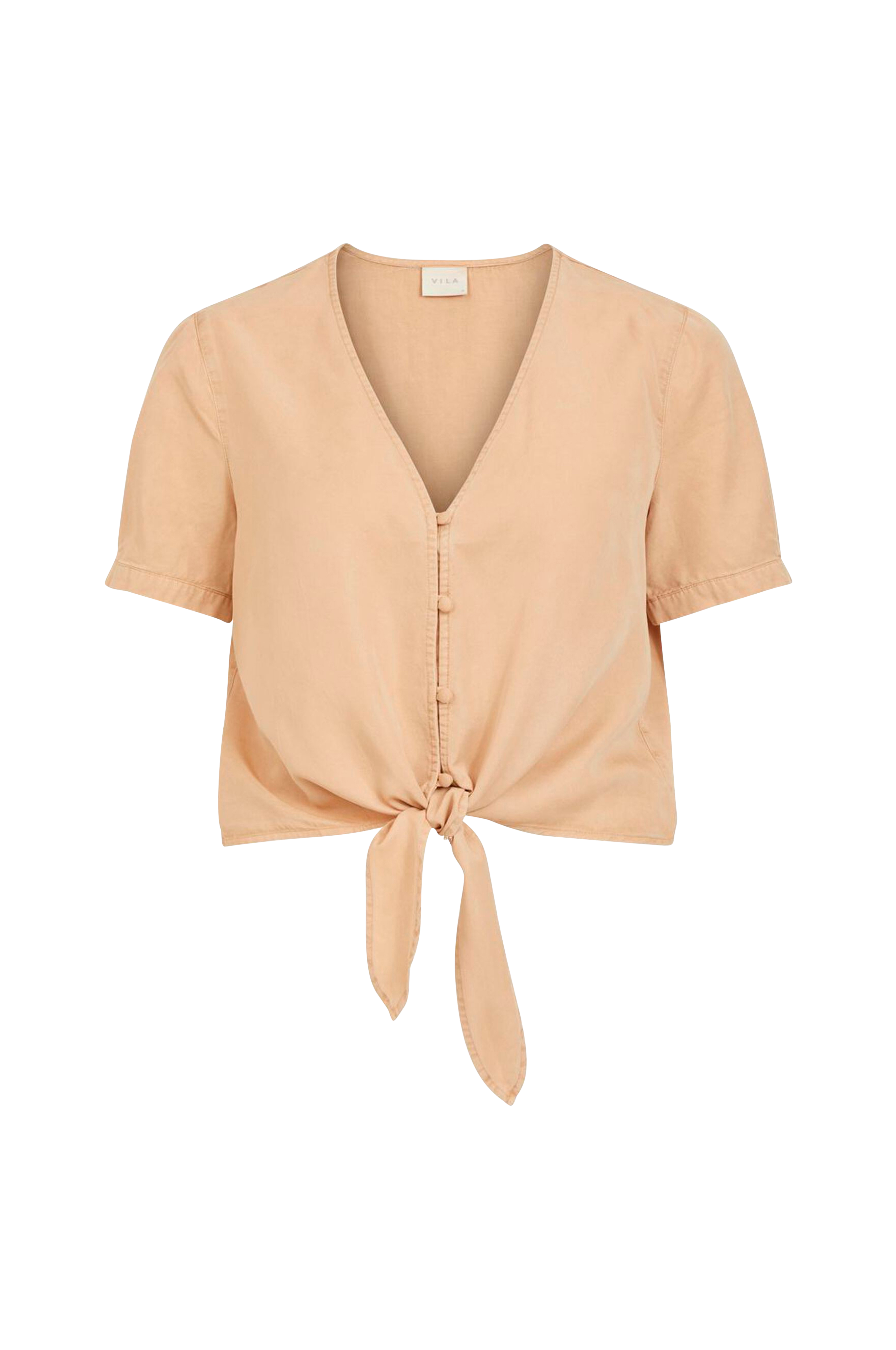 Bluse i litt kortere modell som har knyting foran i nederkanten. V-utringet hals og knapping med kledde knapper samt korte ermer med lagt motlegg nederst.