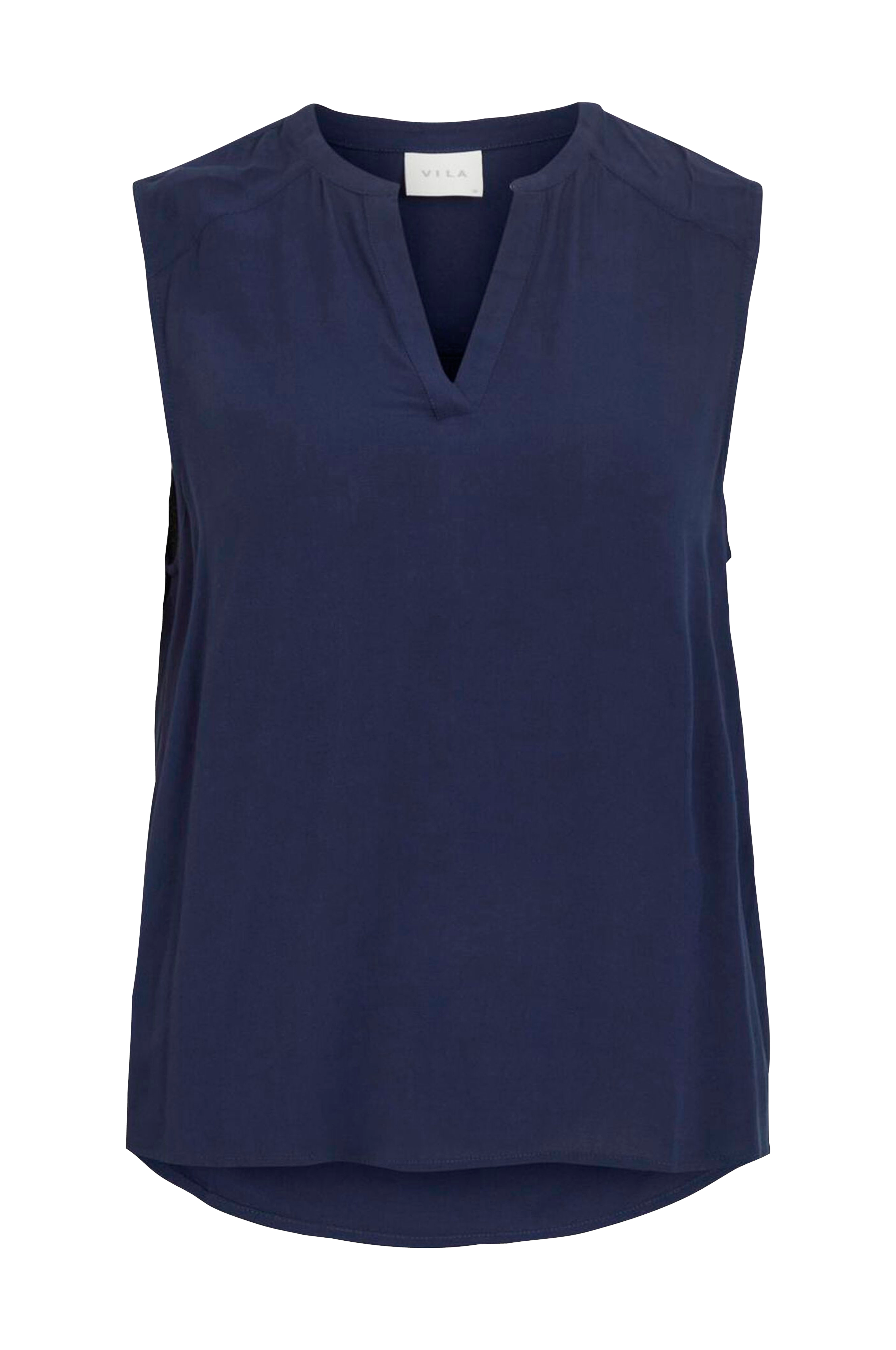 Ermeløs bluse i vevd viskose. V-utringning foran og avrundet nederkant som er lengre bak.