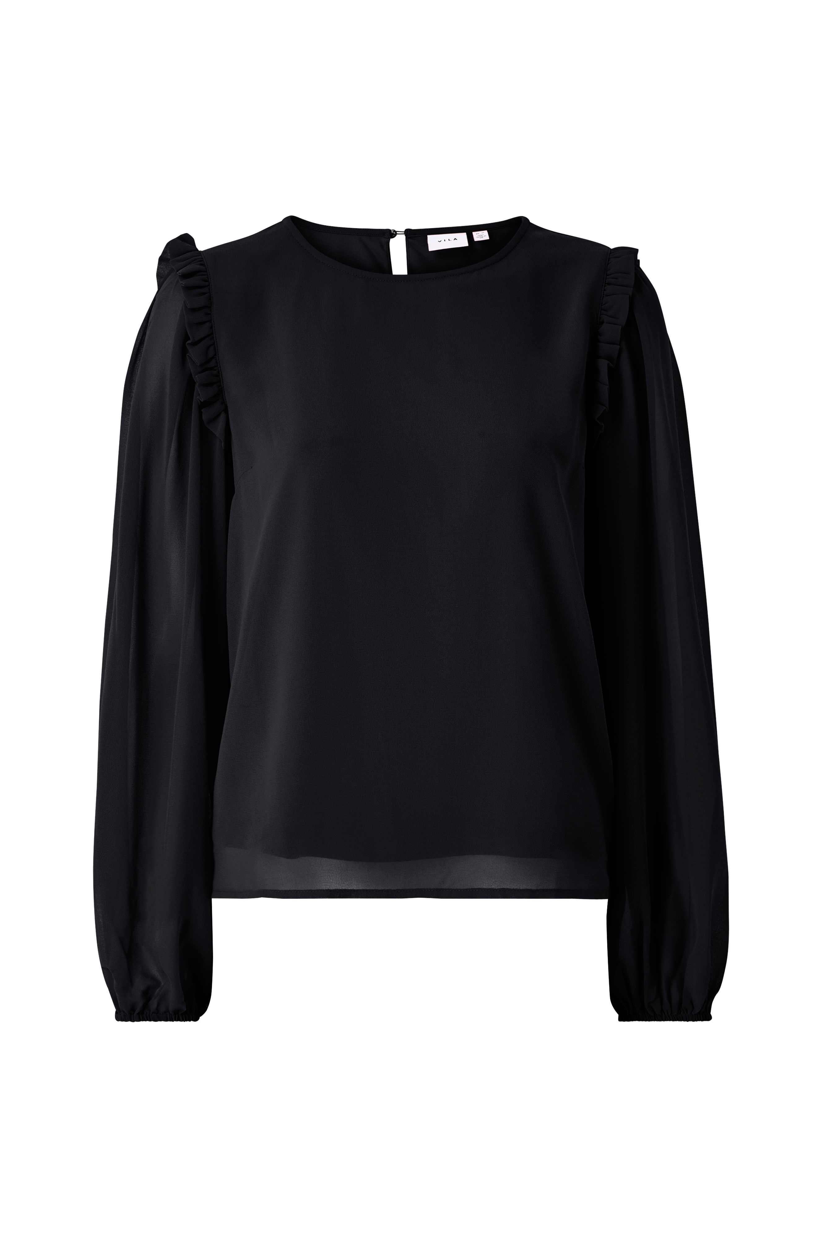 • Fôret bluse • Gjennomsiktig materiale med ugjennomsiktig foring • Rund halsringning • Skjær med knapp i nakken • Volangkanter rundt skuldrene • Ballongermer med gummistrikk i ermeslutten • Produktet inneholder gjenvunnet materiale som er brukt for å redusere mengden avfall, samtidig som det ikke er brukt nye ressurser.