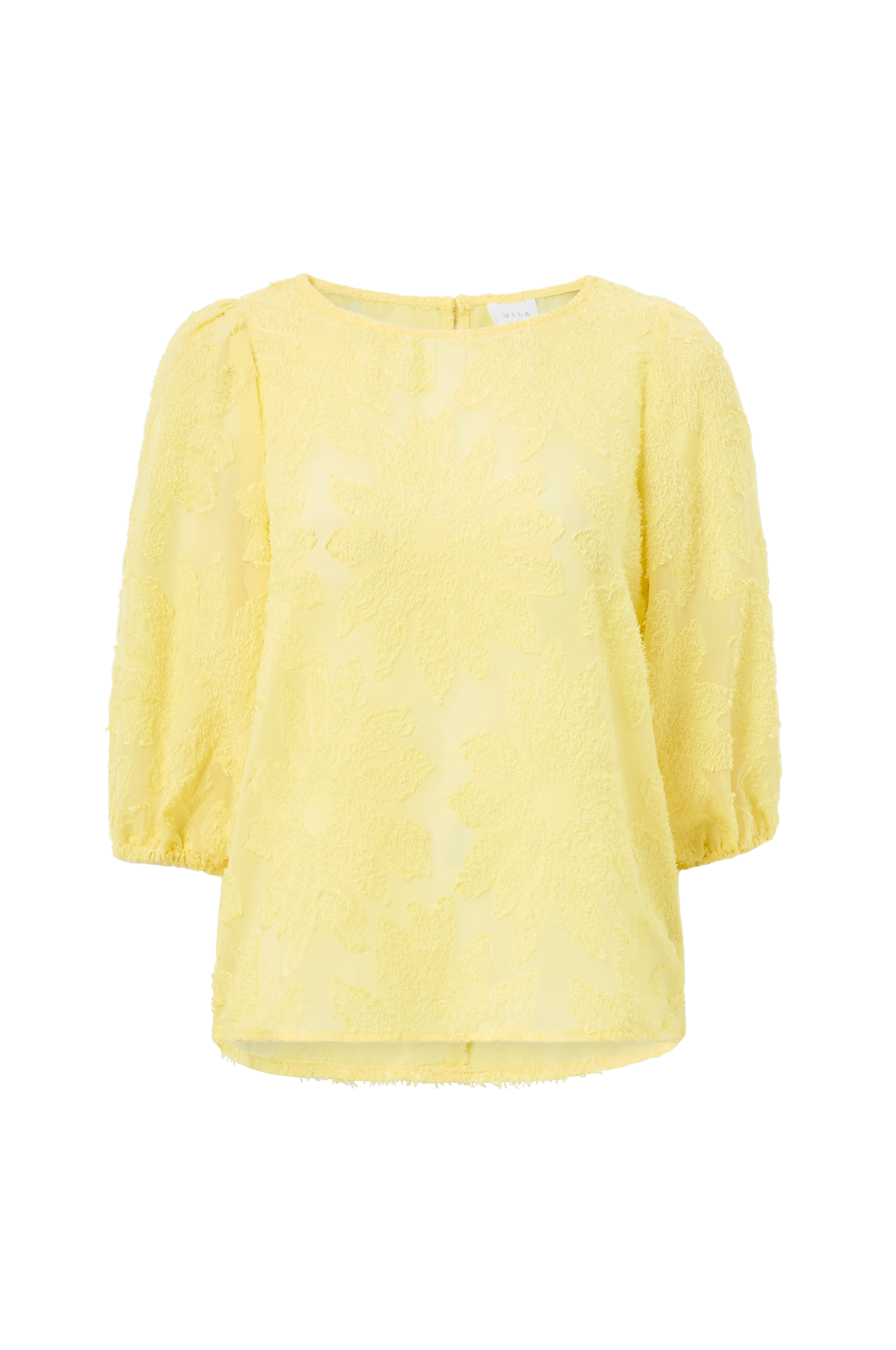 Bluse i halvtransparent, vevd kvalitet med frynsete blomsterapplikasjoner. 3/4-lange ballongermer med elastiske ermekanter. Rund hals med splitt og knapp i nakken.