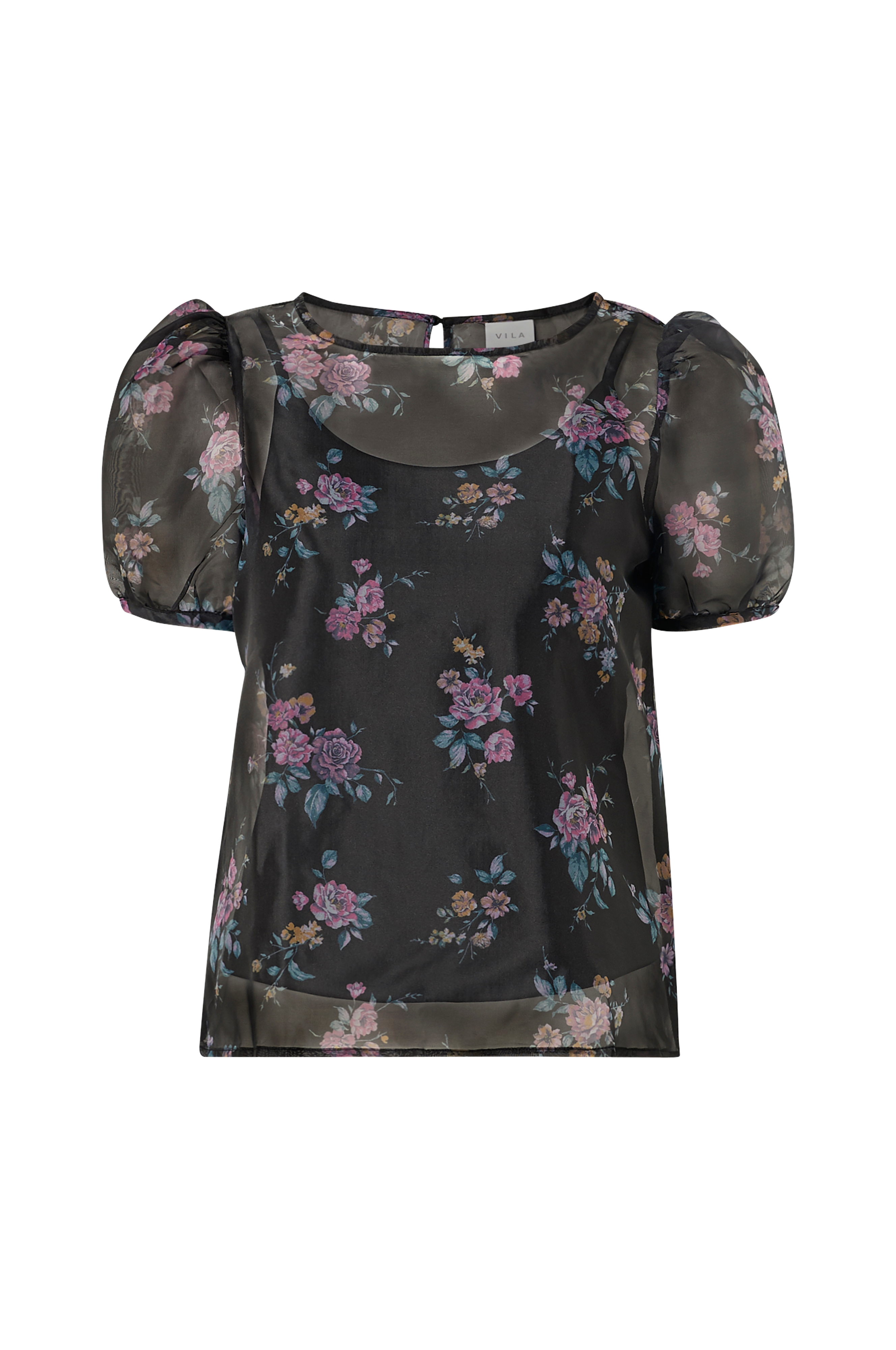Bluse viOrga S/S Top fra Vila i blomstrete, transparent organza med struktur og fin glans. Korte puffermer og splitt og knapp i nakken. Avtagbar trikottrøye.