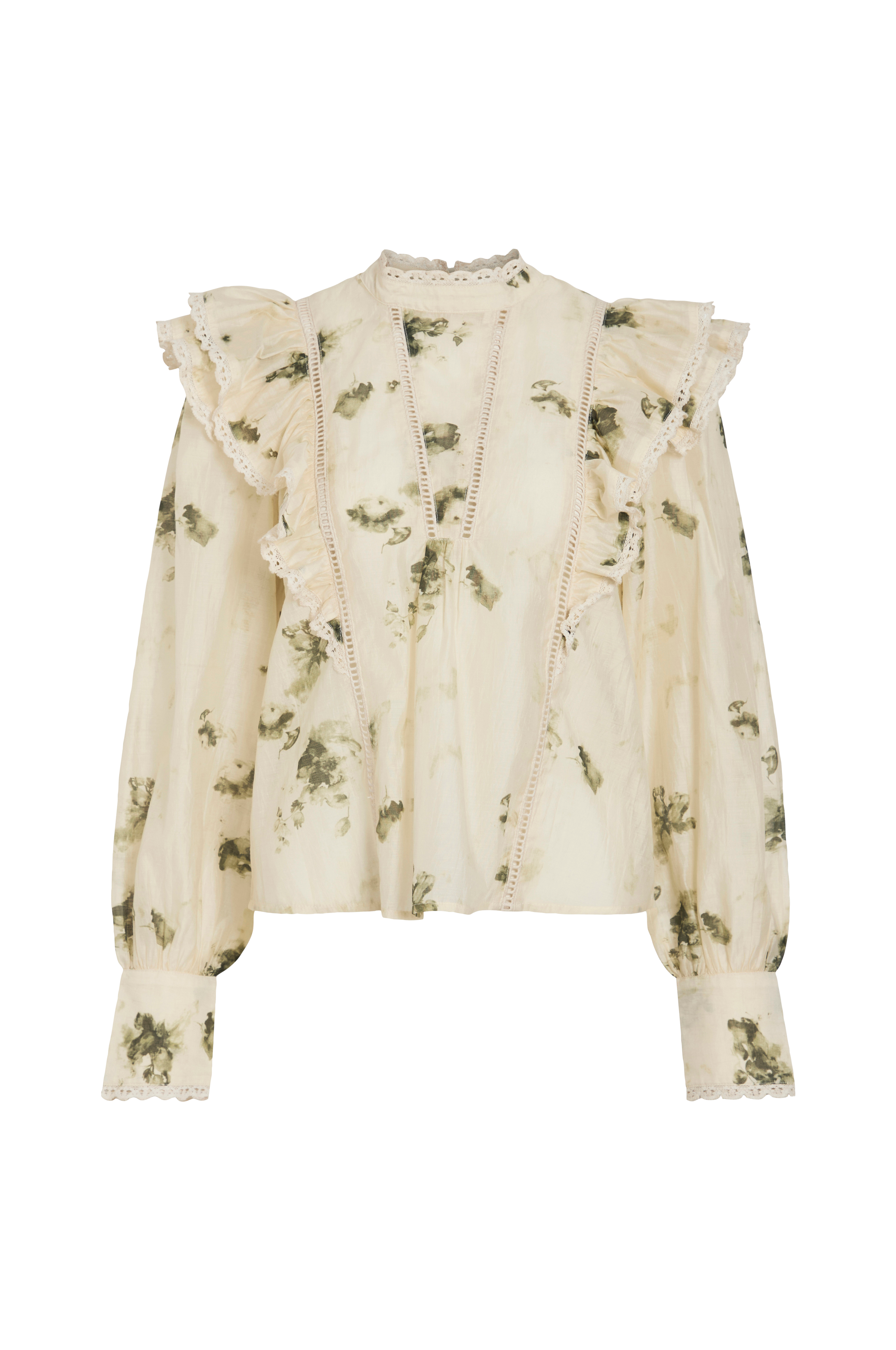 • Gjennomsiktig, mønstret bluse• Skjær med knappstolpe på nakken• Rund hals med blondedetaljer• Blondete volanger på toppen• Brede ermer med knappstolpe ved armenden