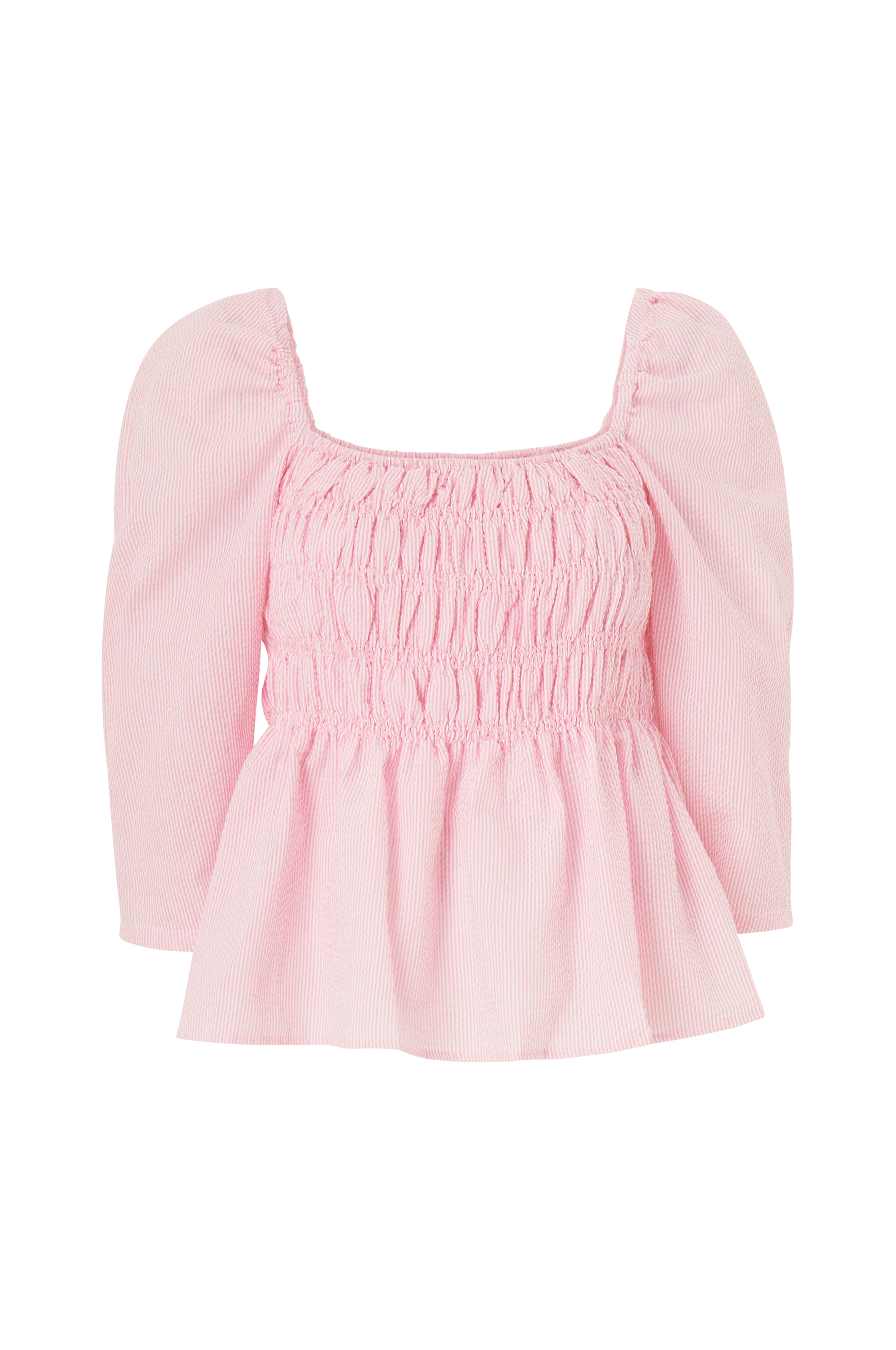 • Peplum-design• Firkantet, elastisk hals• Vaffelsøm på toppen• Bobleermer 3/4 lang