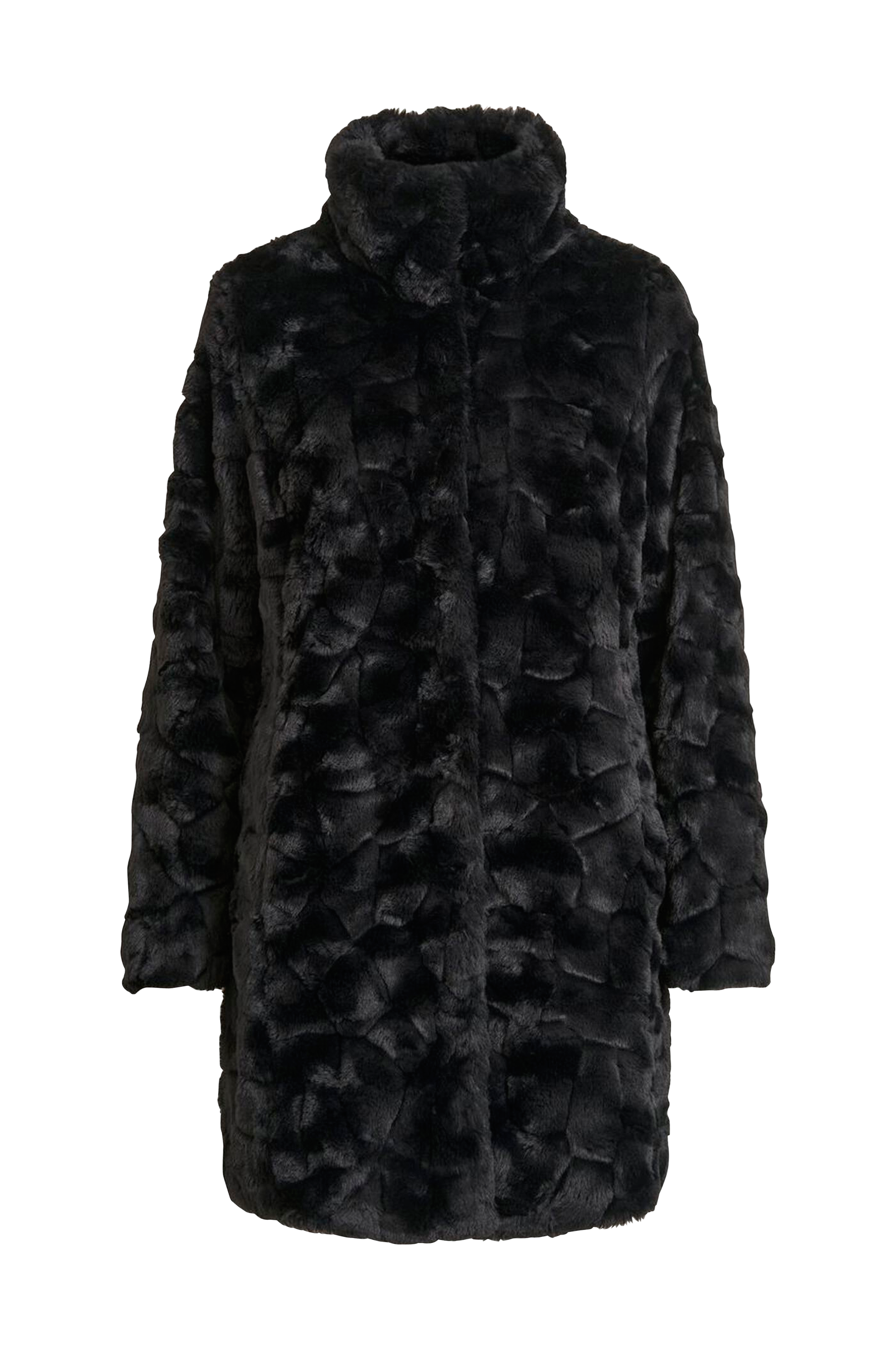 Fuskepels viSeria Coat fra Vila. Rett modell med klippet mønster og høy krage. Knapping foran med skjulte trykknapper, samt to innfelte lommer. Vevd fôr. Lengde ca. 87 cm i str 36.
