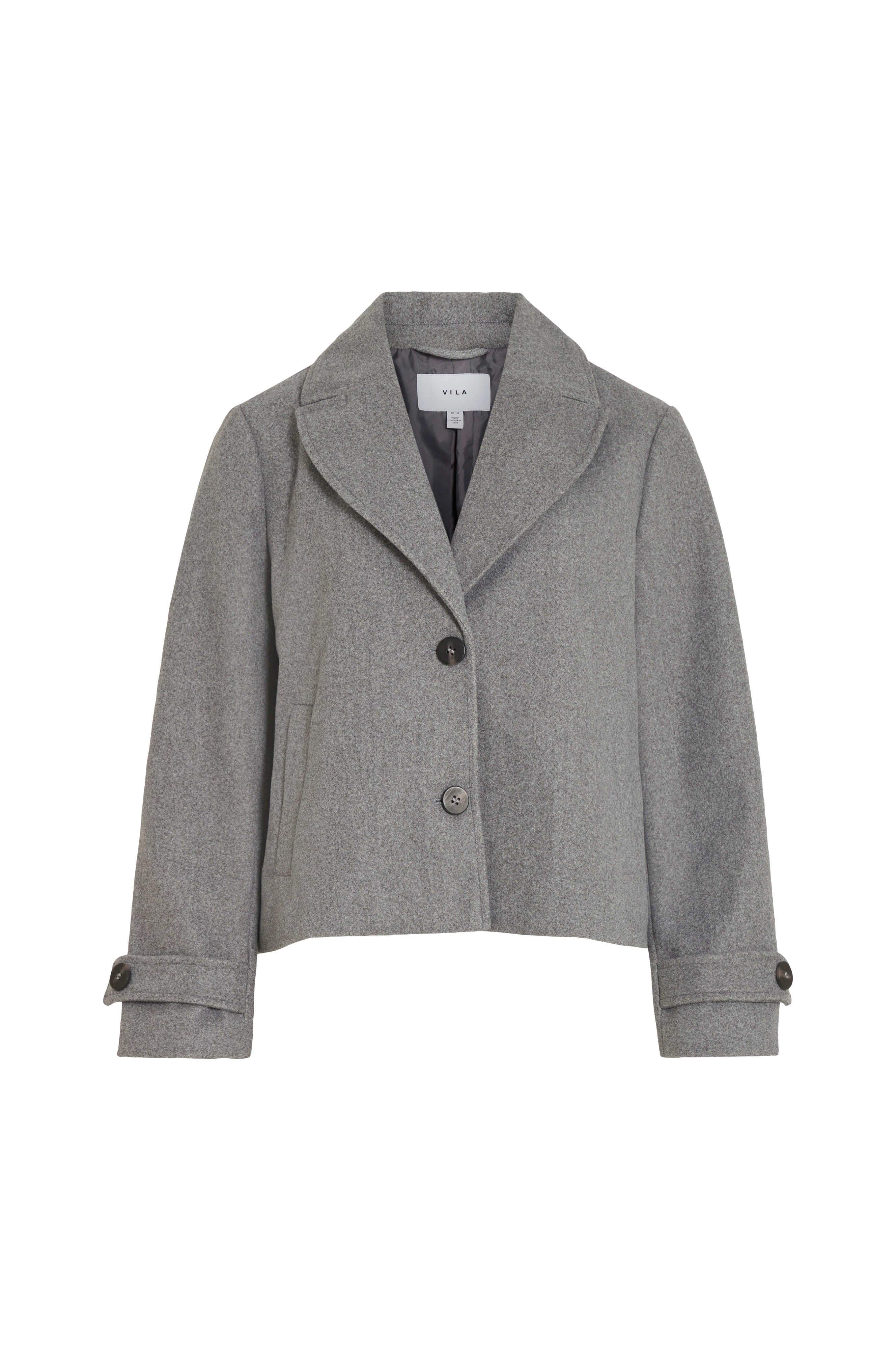 • Kort jakke i filtet kvalitet• Stor krage• Lukning med to knapper• Knappedetalj i ermeslutten• To lommer• Glatt, vevd foring• Lengde: 56 cm i størrelse 36