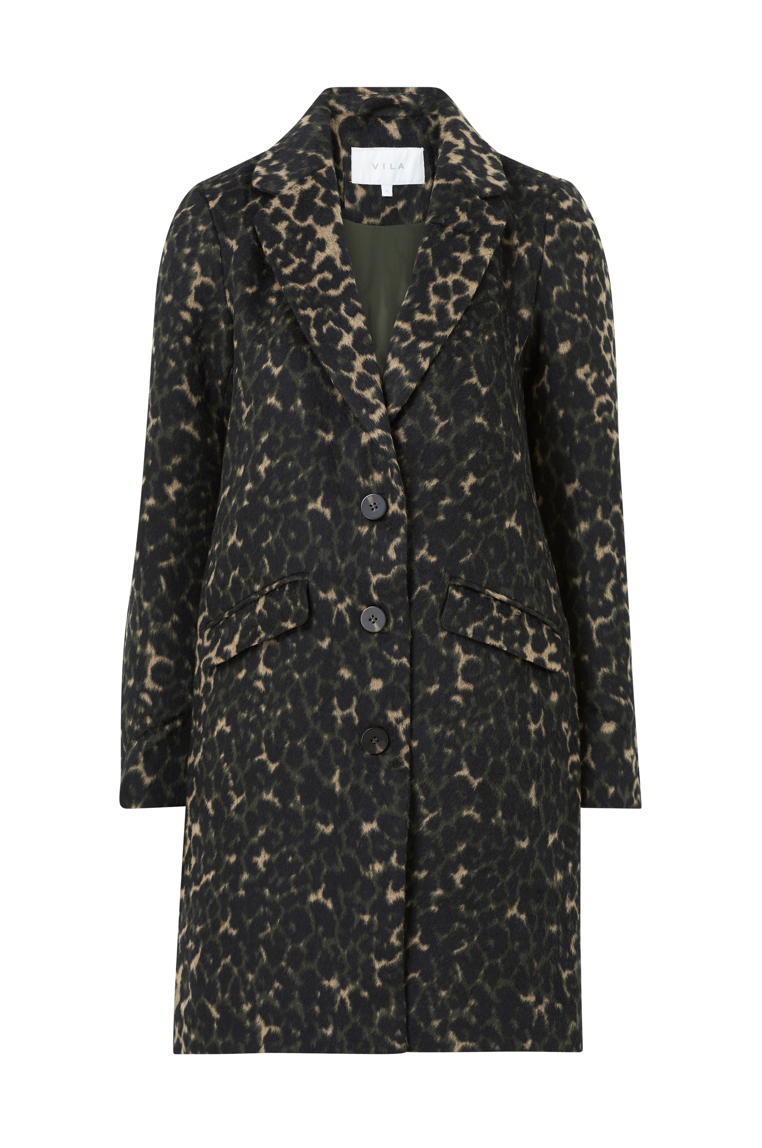 Kåpe viLeovita Coat fra Vila. Rett modell med krage og slag samt tre knapper foran. Innvendige skulderputer og to innfelte passepoillommer med klaff. Lengde ca. 92 cm i str 36.