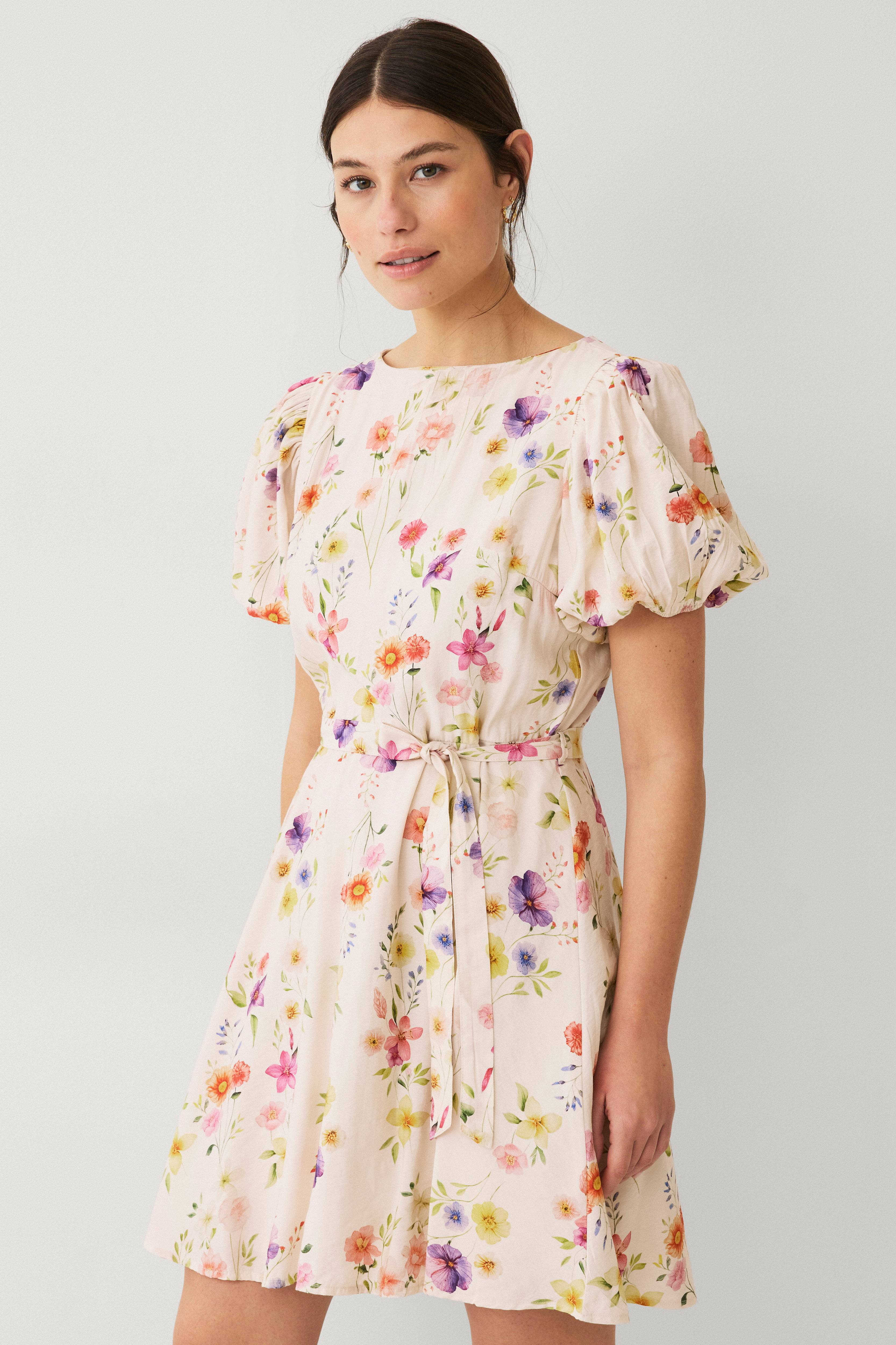• Utsvingt modell• Bred hals med knapp i nakken• Kort bobleerme med gummistrikk i ermeslutten• Markert midje med små stropper og knytbart belte• Fôret• Lengde: 90 cm i størrelse 36