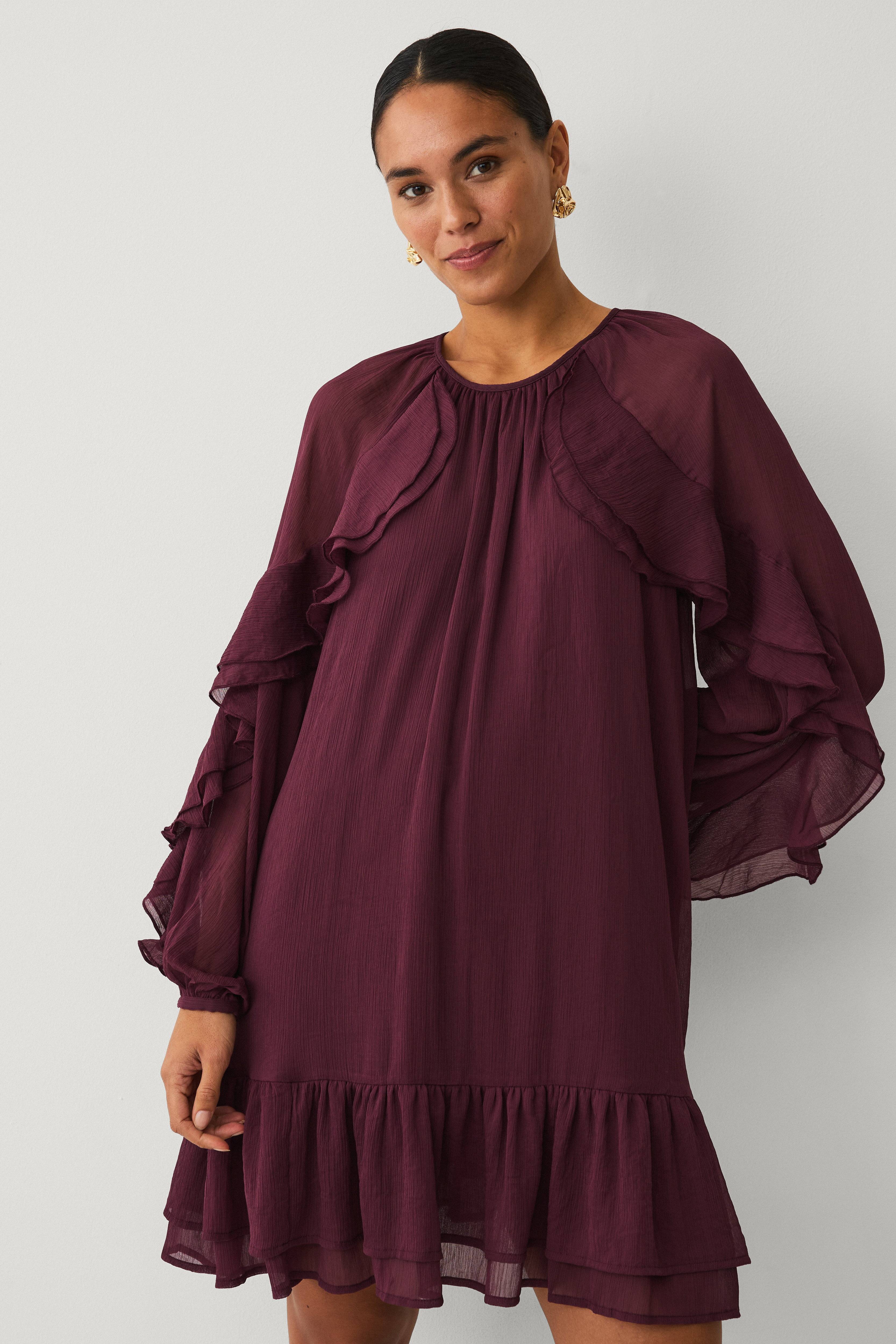• Fôret kjole i rynket materiale• Løs passform• Rund hals med nøkkelhulsåpning og knapp i nakken• Lange, ufôrete ermer med skjær og knapp i ermeslutten• Volang foran og langs med ermene• Volang i nedre kant• Lengde: 95 cm i størrelse 36