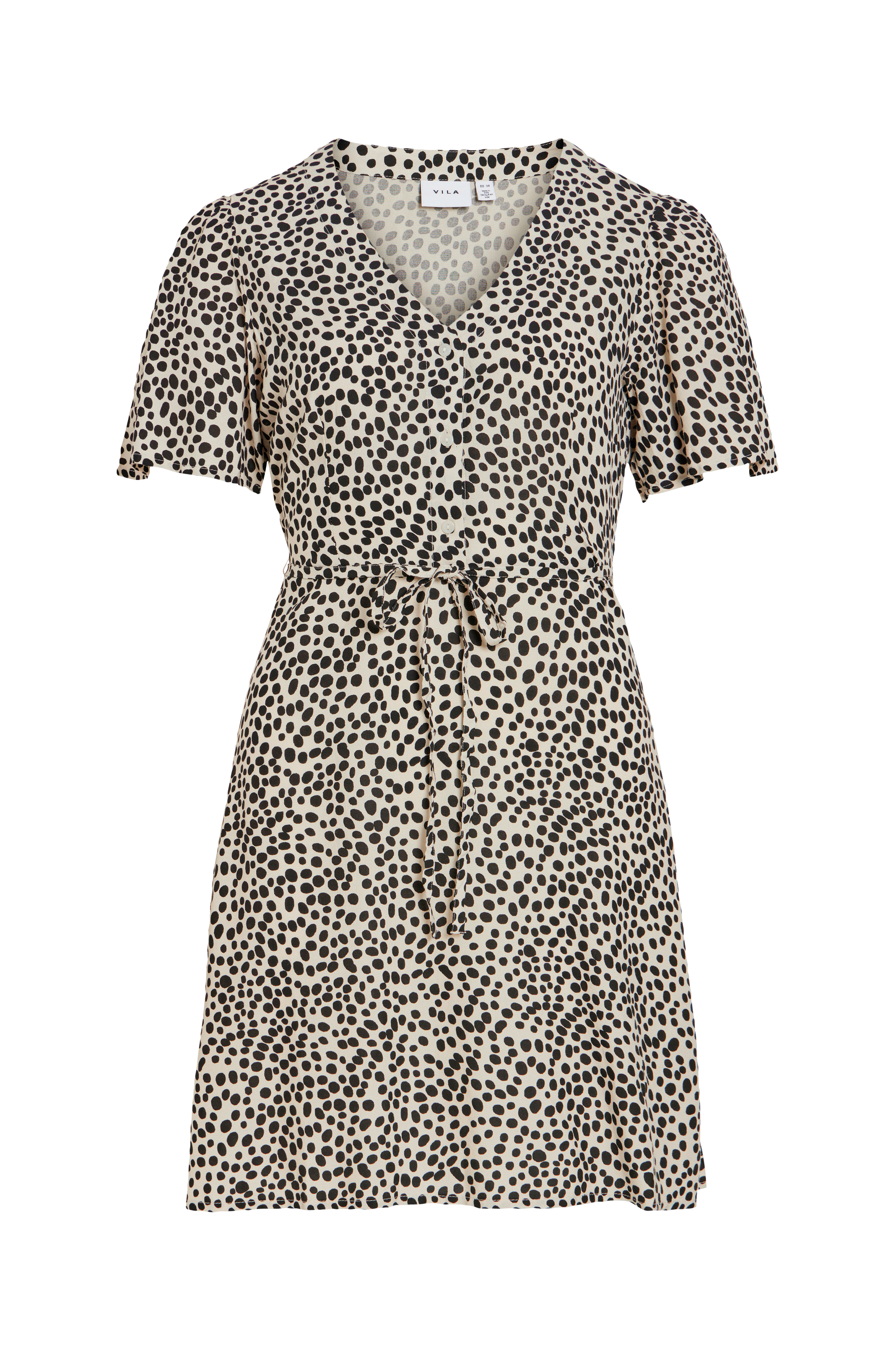 • Mønstret kjole i viskose• V-hals• Knapper oppover foran• Korte bobleermer• Knytbart belte ved midjen• Lengde: 90 cm i størrelse 36