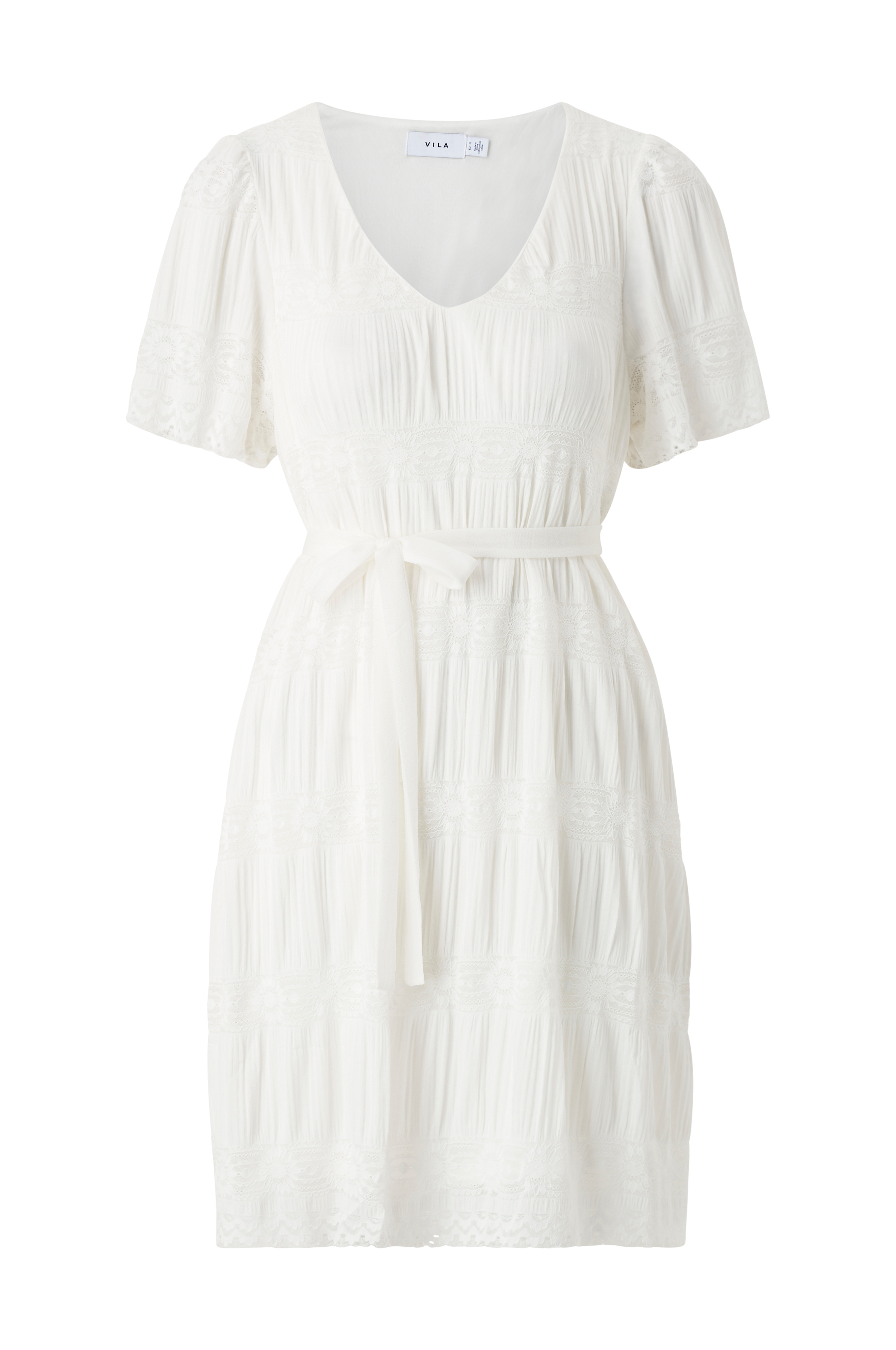• Kjole med blondedetaljer• V-hals snitt• Korte ermer• Trikotfôr• Knytbar stropp ved midjen• Lengde: 90 cm i størrelse S