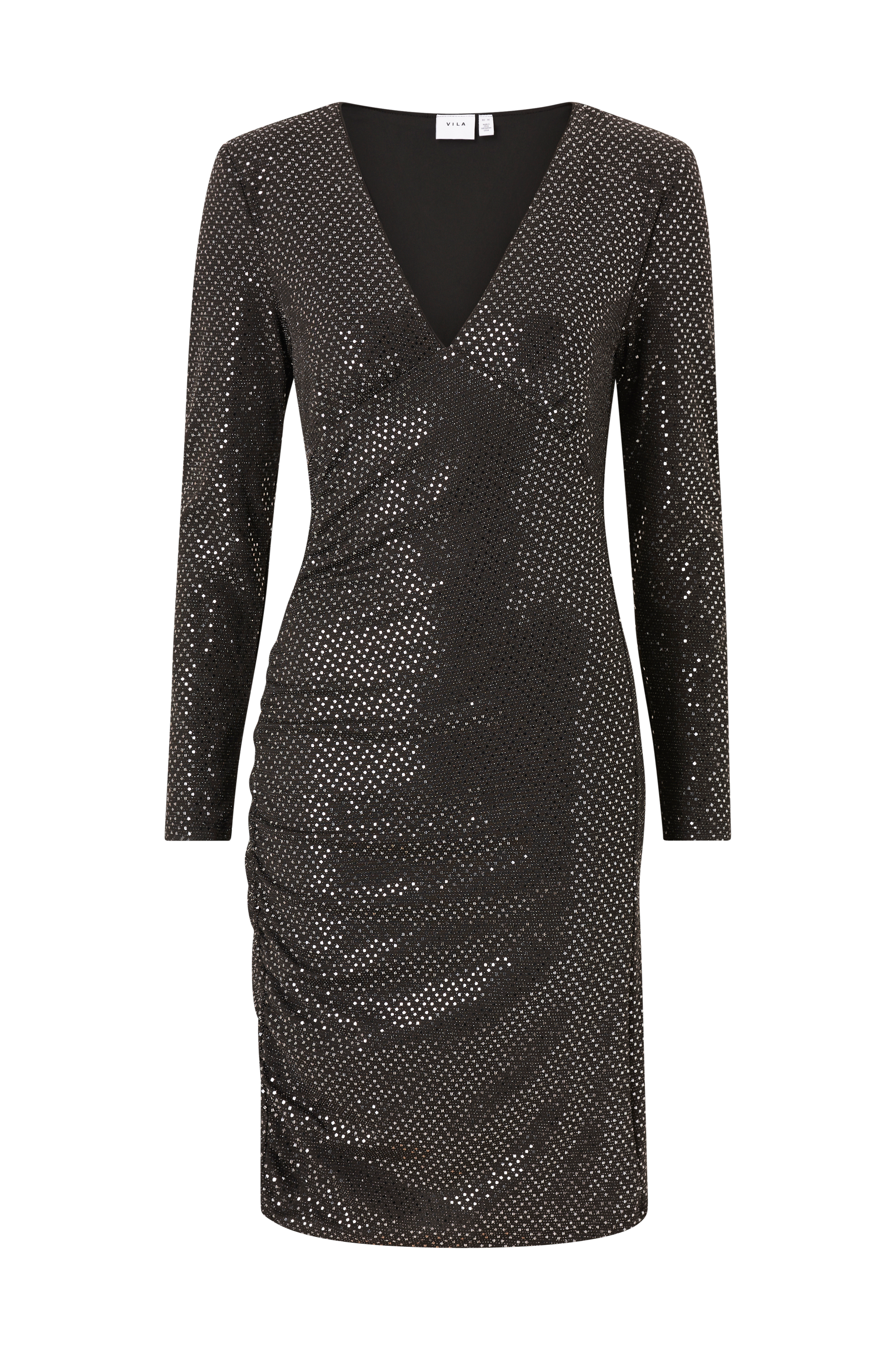 • Glitrende kjole• Ettersittende passform• V-hals snitt• Rysje ved bysten• Samlet drapering foran• Skulderputer• Lengde: 96 cm i størrelse 36