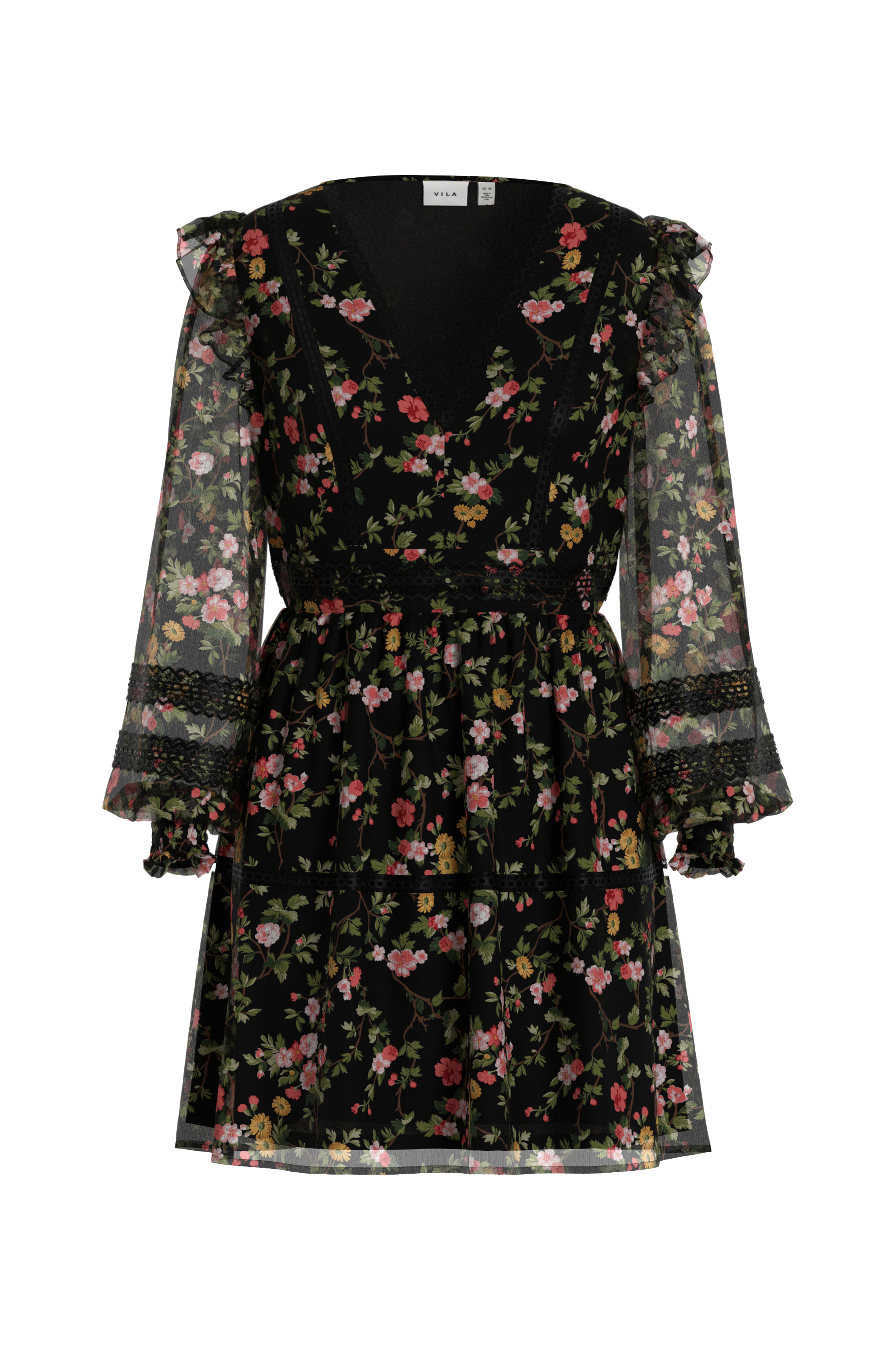 • Kjole i chiffon• V-hals snitt med blondekant• Gjennomsiktige ballongermer med vaffelsøm i ermeslutten• Volanger på skuldrene• Trikotfôr• Lengde: 90 cm i størrelse 36