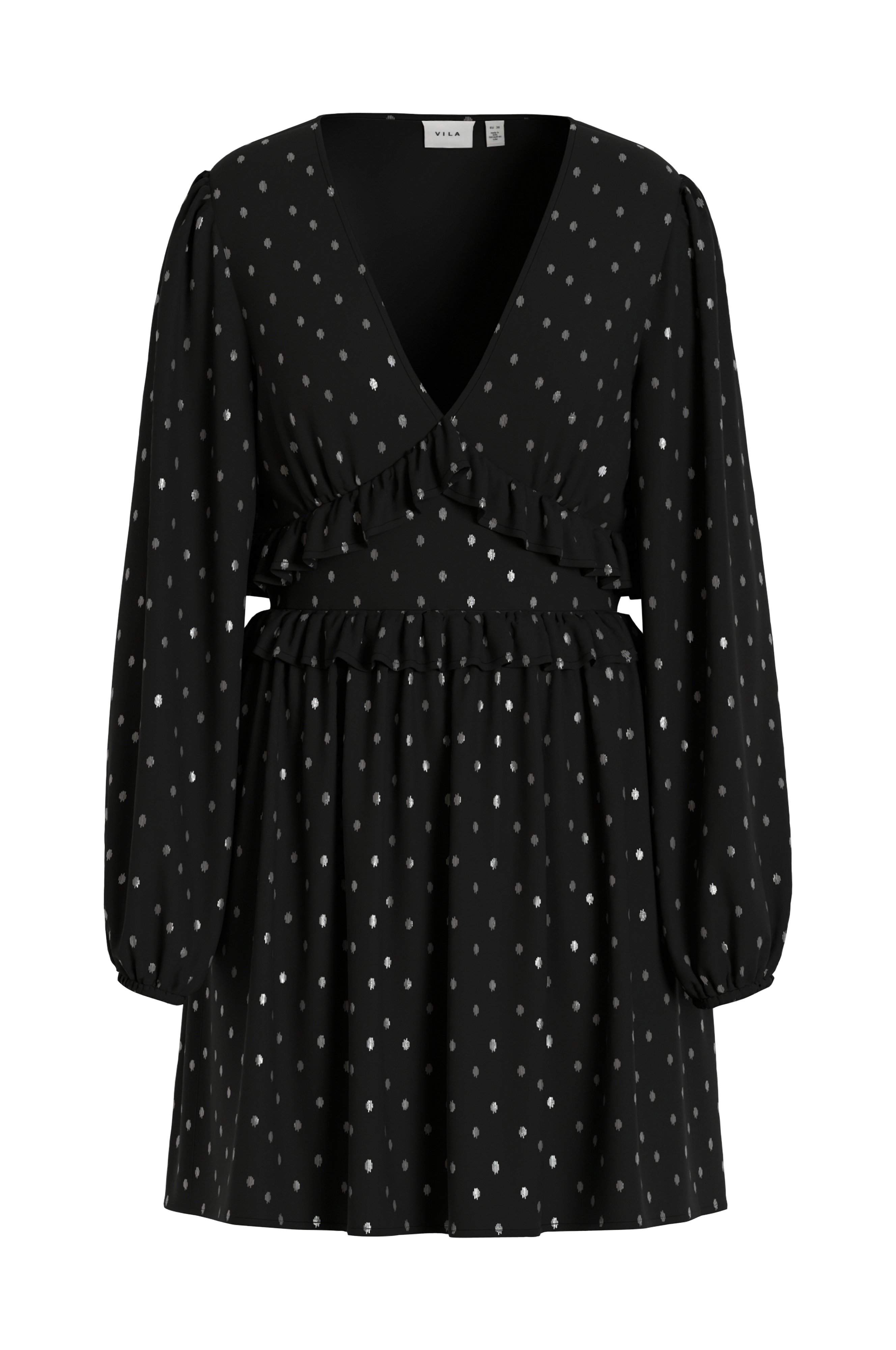• Fôret kjole i chiffon med v-formet hals• Sølvaktige prikker rundt• Lange puffermer med gummistrikk i ermeslutten• Volanger ved midjen• Glidelås i siden• Lengde: 92 cm i størrelse 36