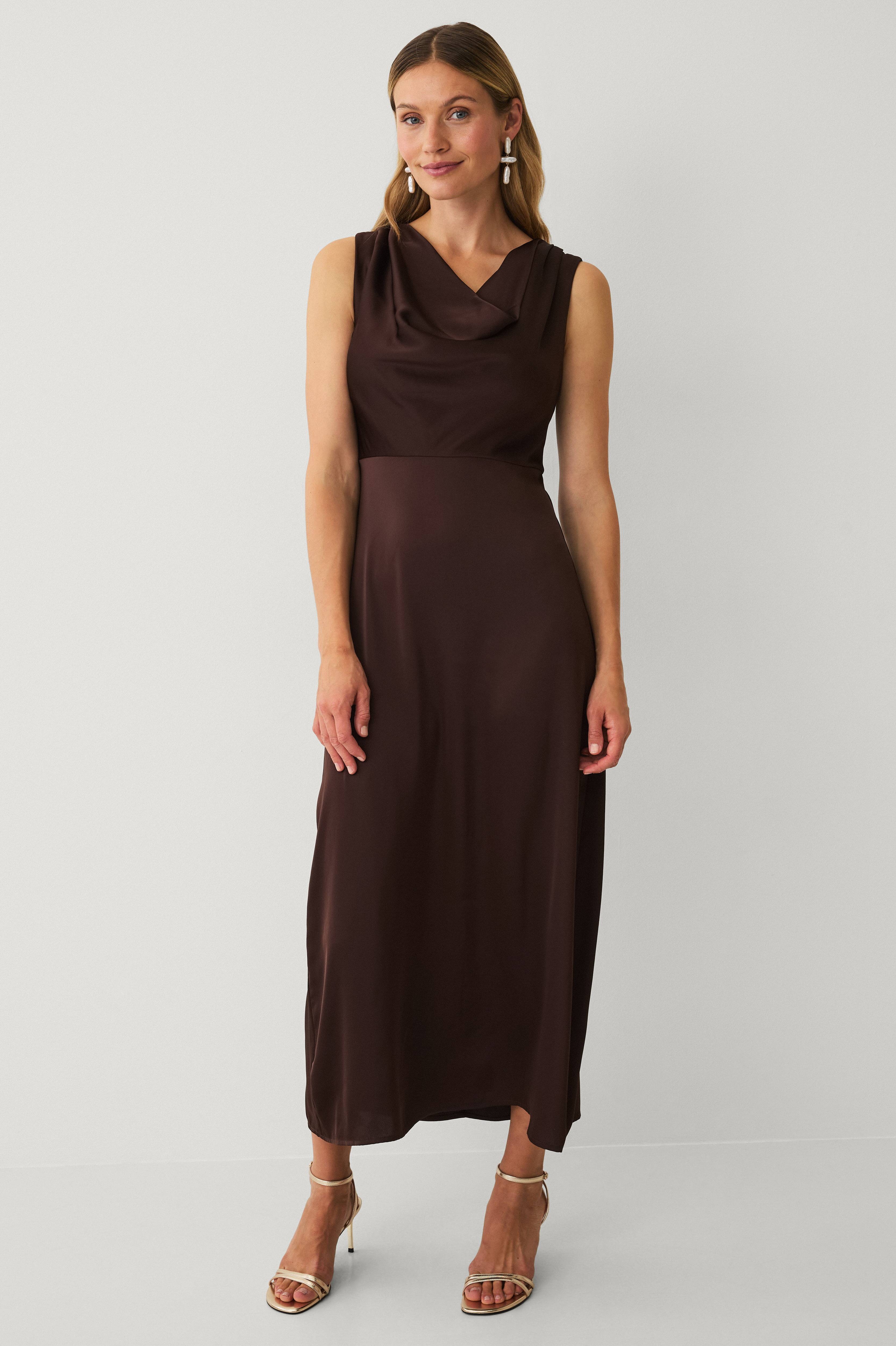 • Lang, ermløs kjole i sateng• Drapert hals• Skjult glidelåslukking i ryggen• Lengde: 136 cm i størrelse S