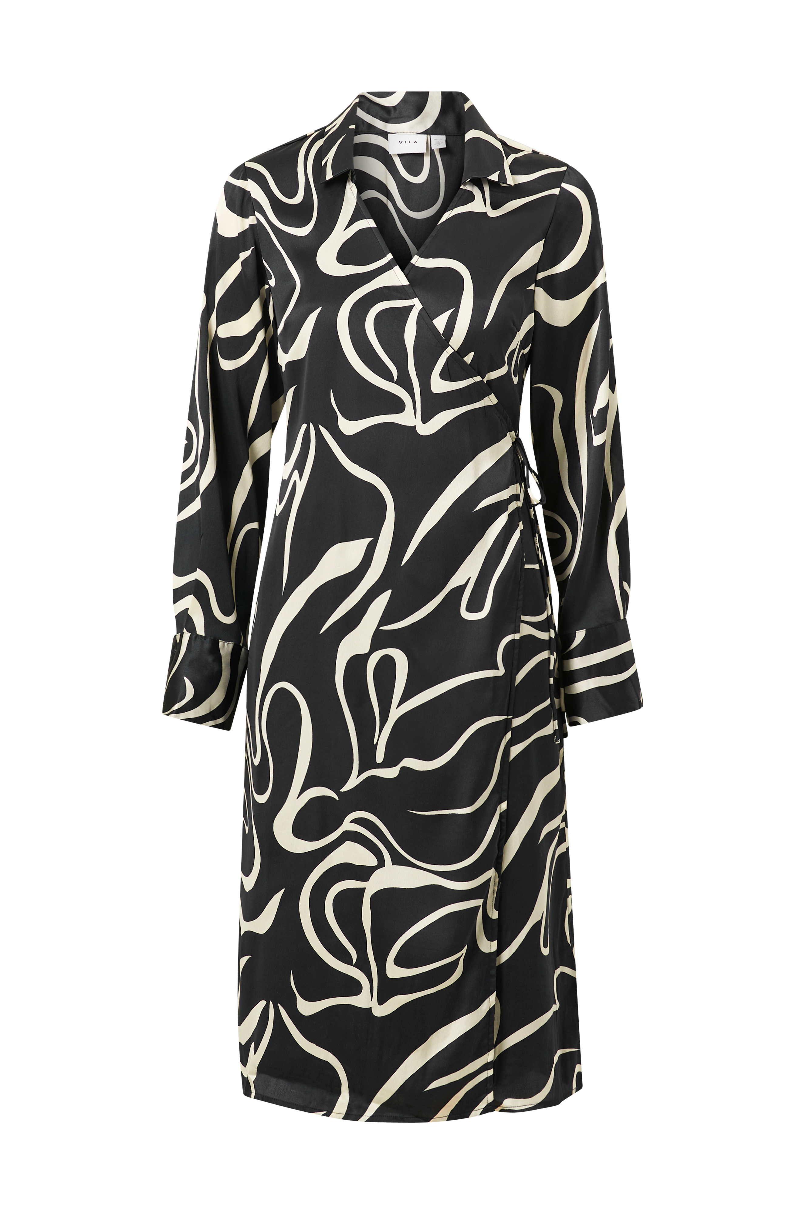 Omslagskjole med knytebånd i siden. Lange ermer med mansjett i ermekantene. Kvalitet med glans. Lengde ca. 113 cm i str 36.