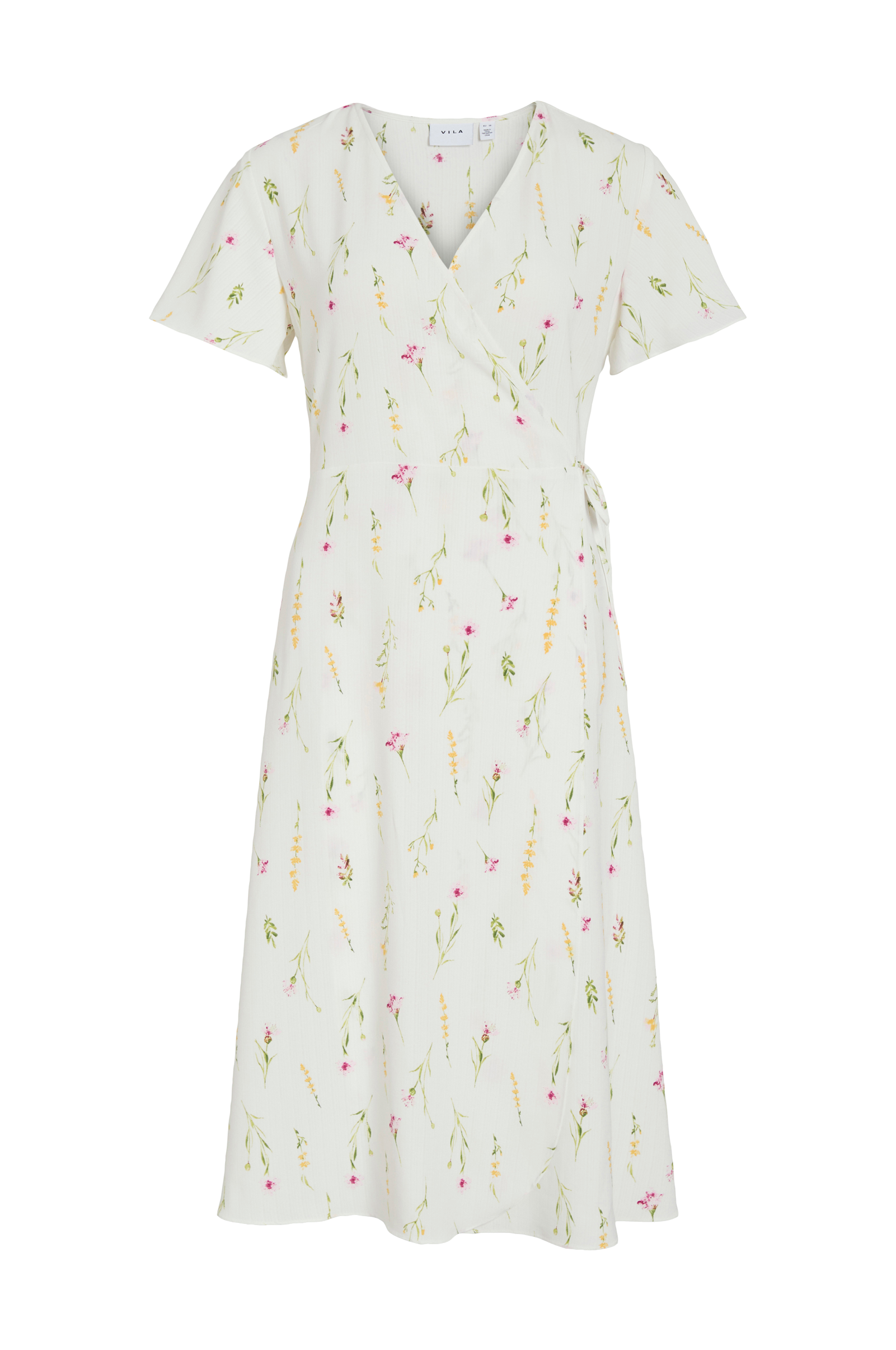 Åpen omslagsmodell med avskjæring rundt i midjen og smalt knytebelte, samt korte, klokkeformede ermer. Lengde ca. 114 cm i str 36.