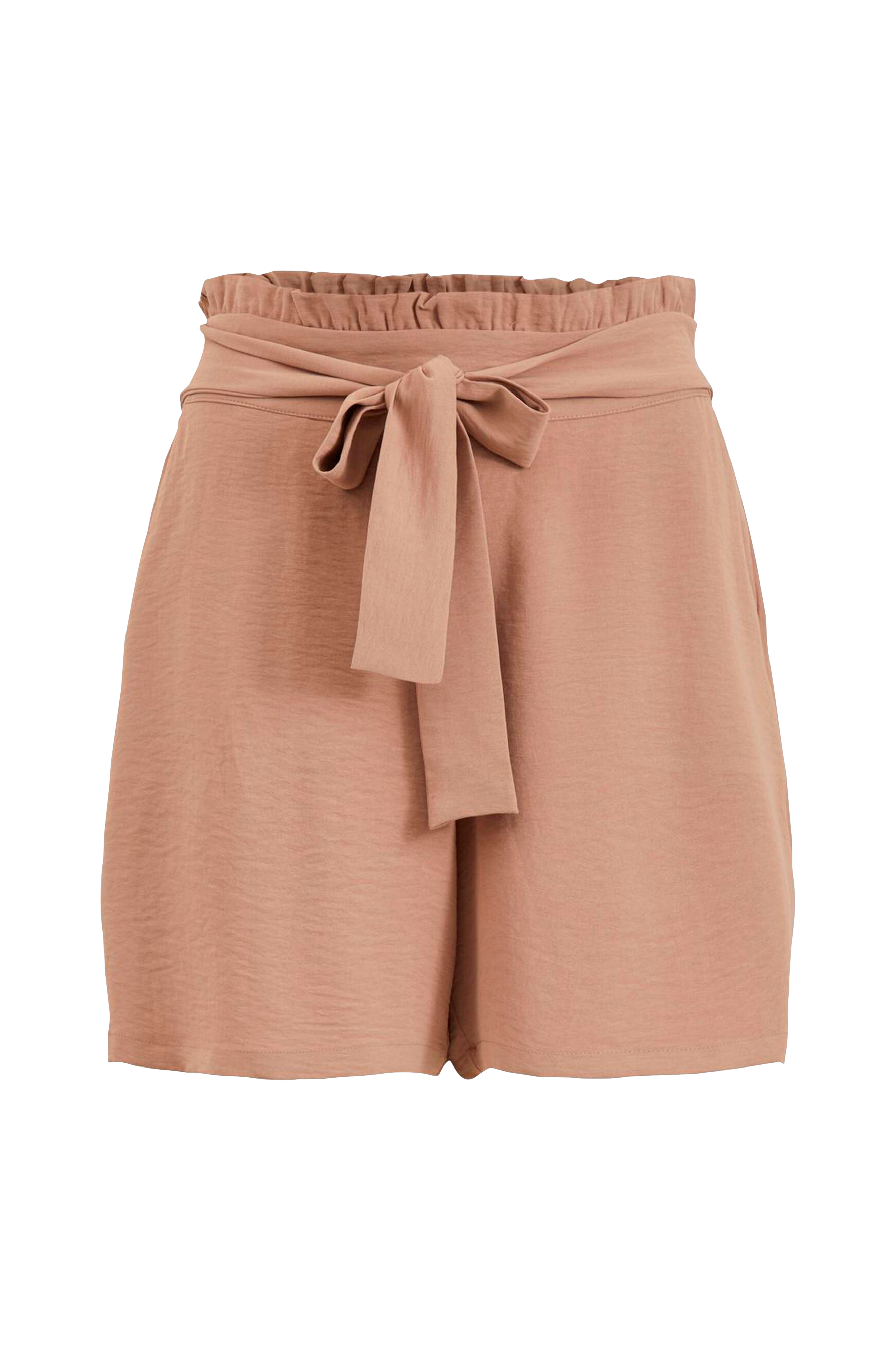 Shorts i ledig form med rette ben. Høy midje med linning som er glatt foran, har strikk bak og fastsydd knytebelte i sidene samt volangkant øverst. To skrålommer foran. Indre benlengde ca. 11 cm i str 36.