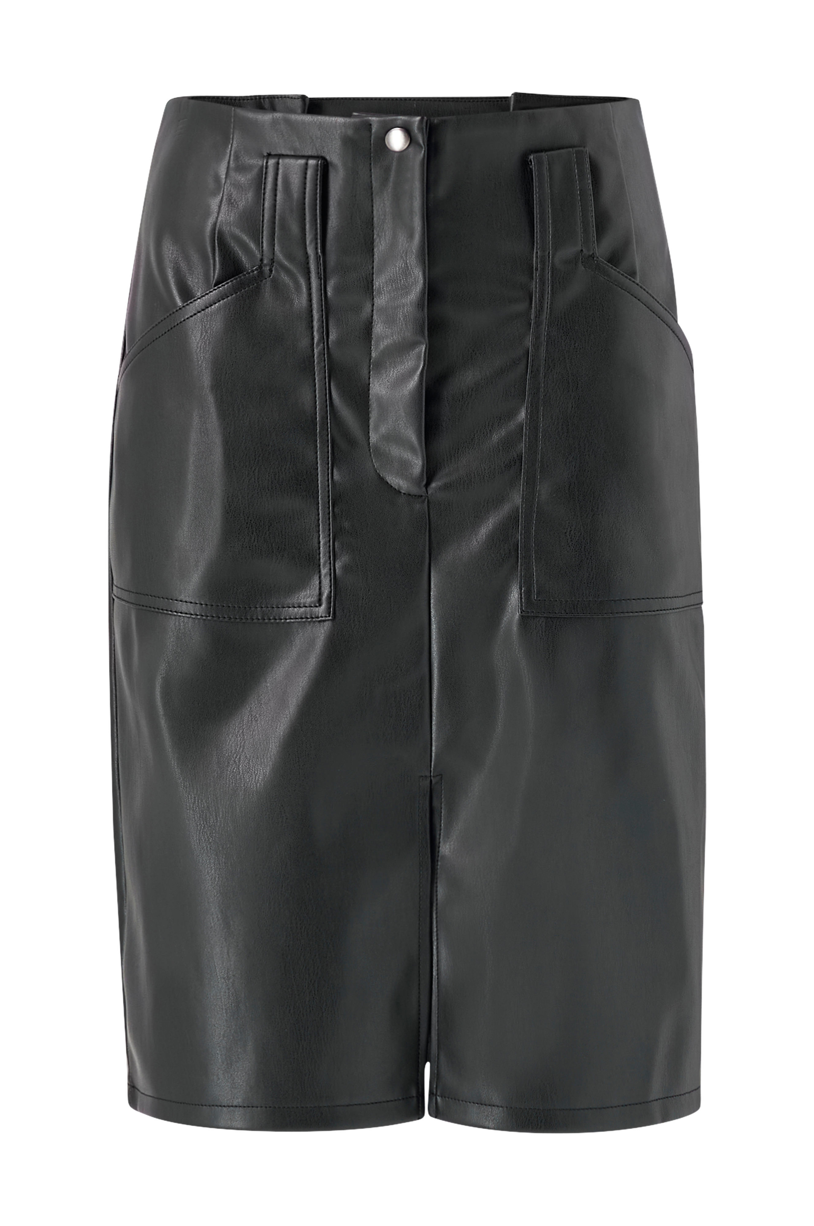 • Skjørt i skinnimitasjon • Elastisk strikk i midjen bak • Trykknappslukning • Glidelås foran • To lommer foran • Splitt foran • Lengde: 57 cm i størrelse 36 • Produktet inneholder gjenvunnet materiale som er brukt for å redusere mengden avfall, samtidig som det ikke er brukt nye ressurser.