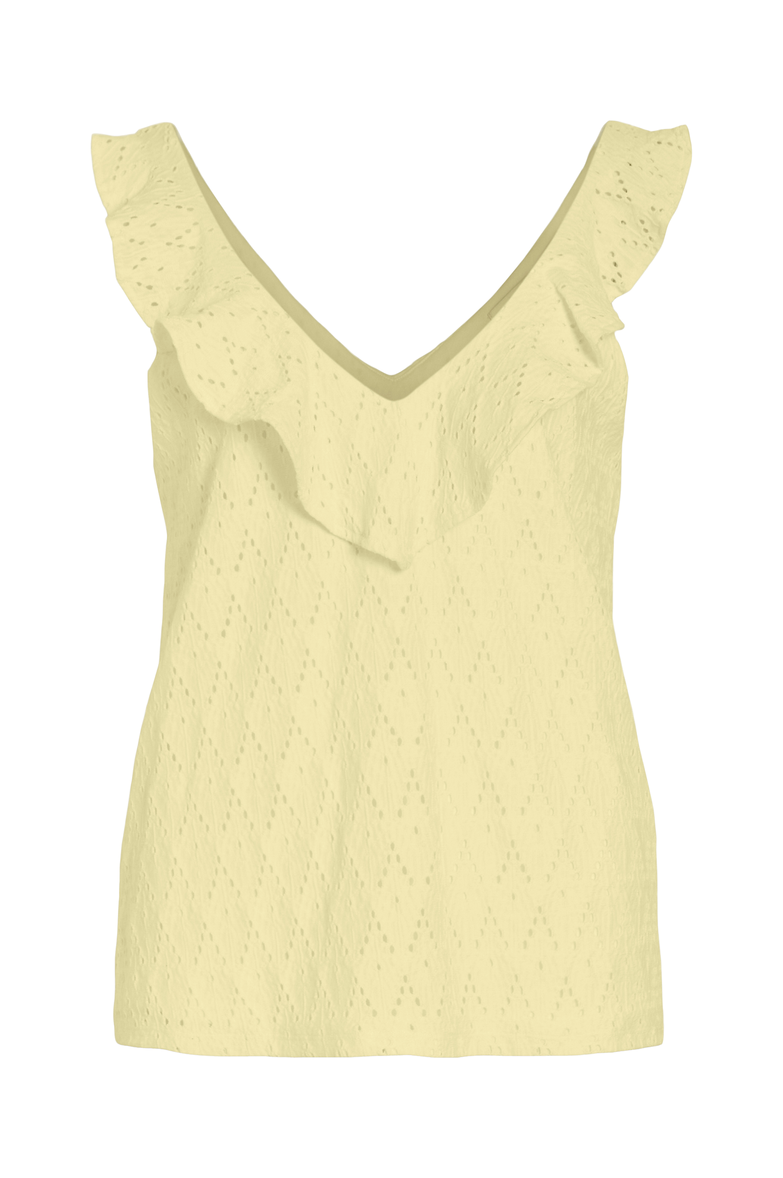 • Ermløs topp med hullmønster• V-formet hals med volang rundt• Trikotfôr