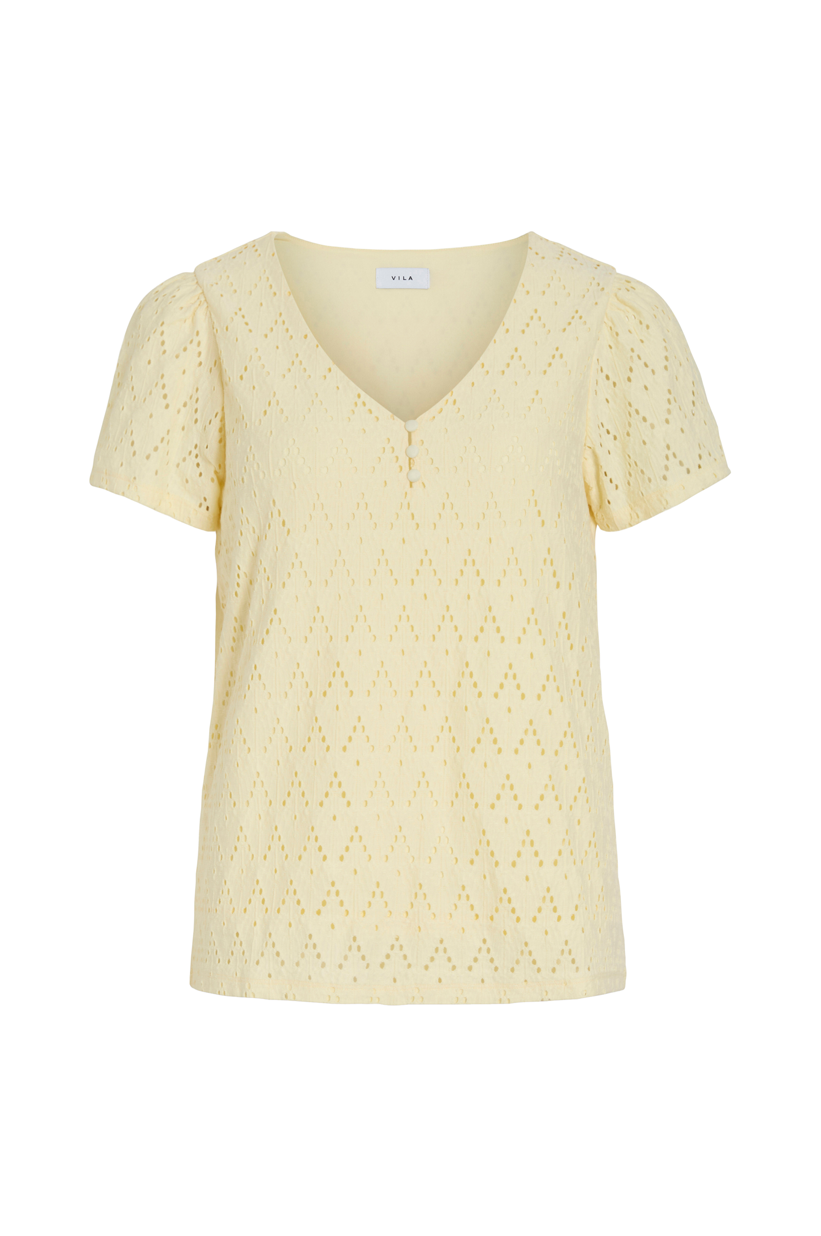 • Topp i hullmønstret jersey• V-hals snitt med kledde knapper• Kort erme• Trikotfôr