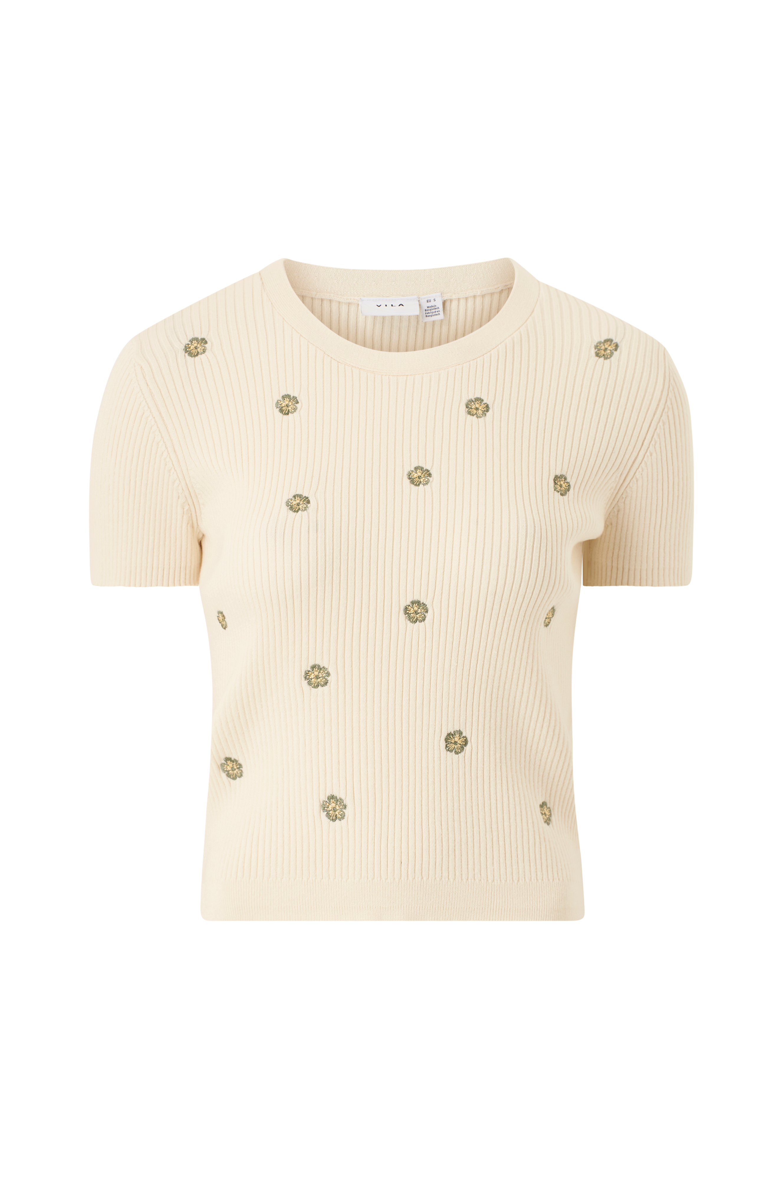 • Ribbestrikket modell med broderi foran• Kort erme