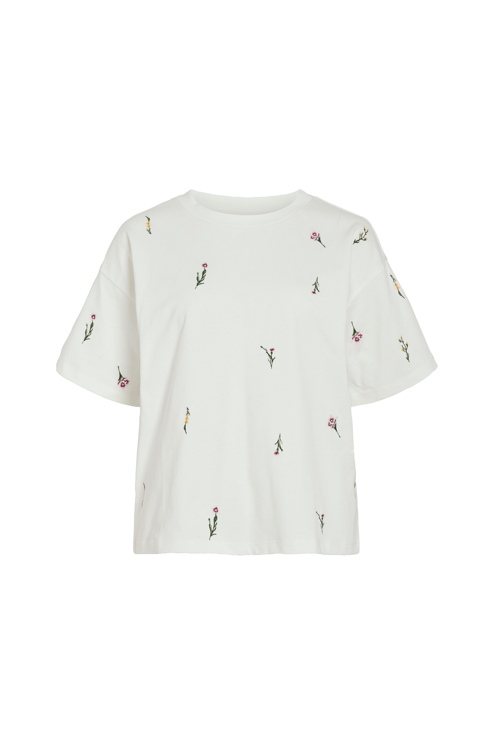 • Topp i bomullsjersey med broderte blomster• Korte ermer• Utringede skuldre• Rund hals