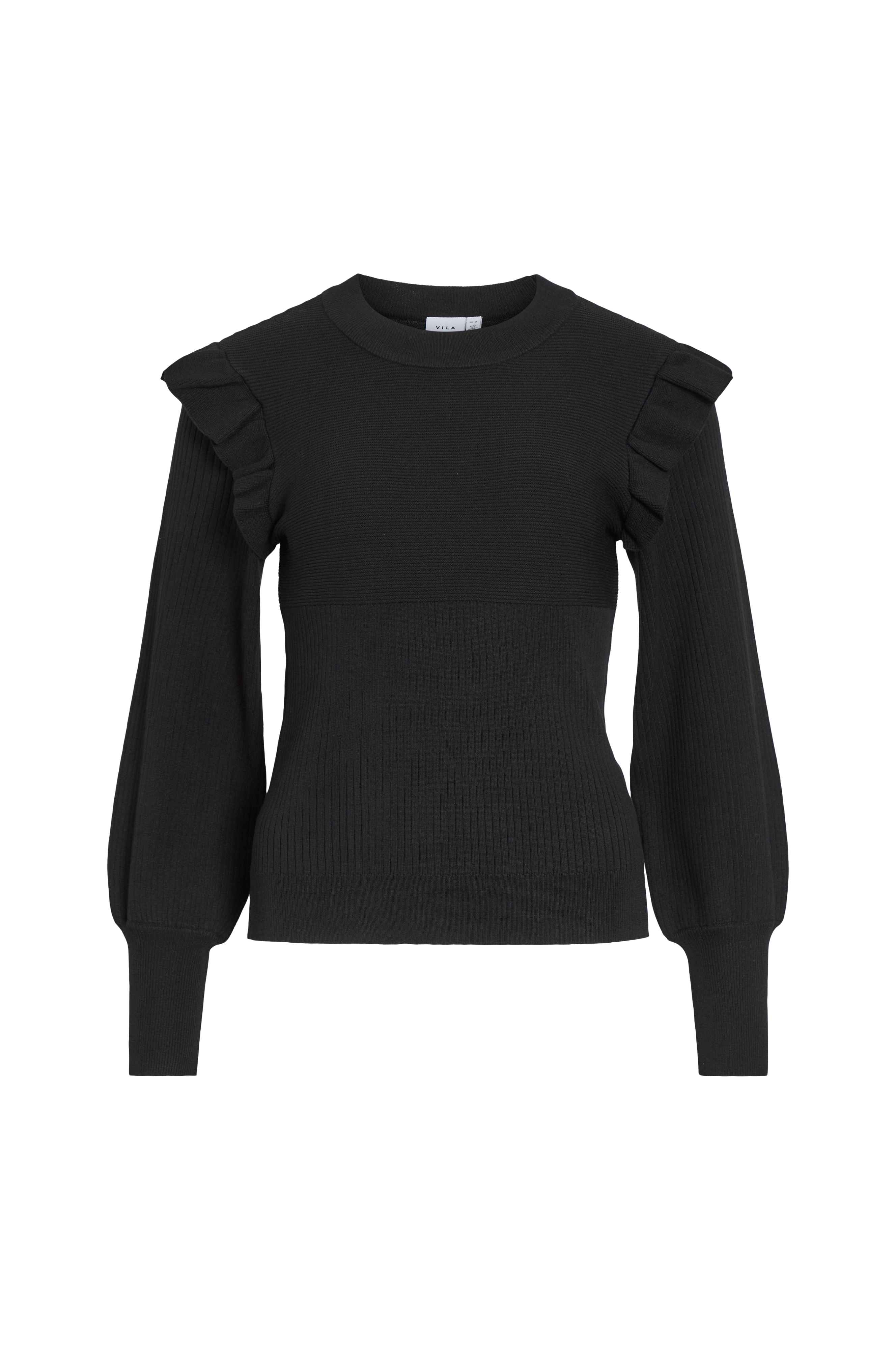 • Ribbestrikket modell med strikket volanger rundt skuldrene• Rund hals• Bred mansjett i ermeslutten