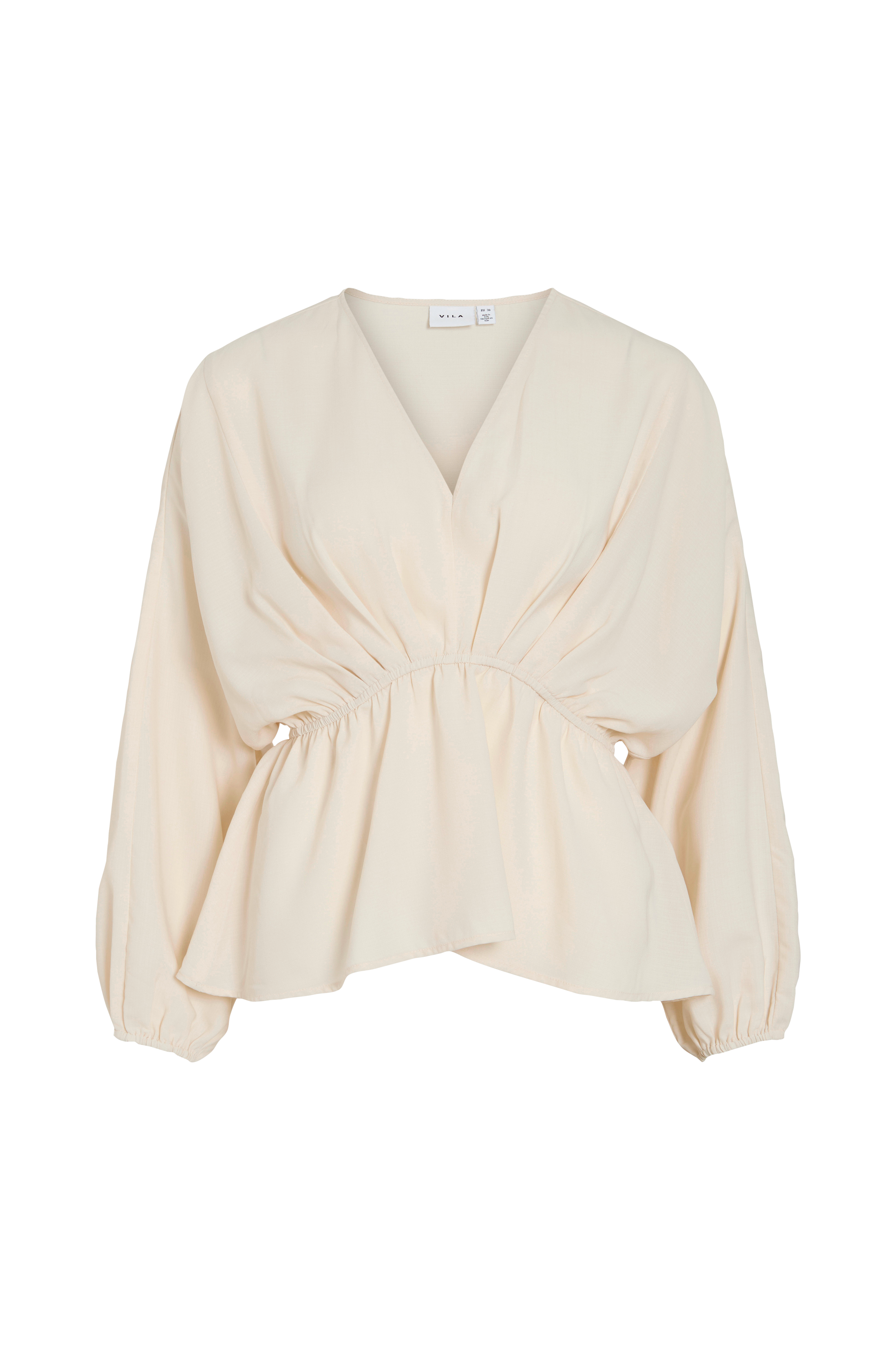 • Topp med peplum-design• V-formet hals• Lange, brede ermer med gummistrikk i ermeslutten• Gummistrikk ved midjen• Motfold på toppen