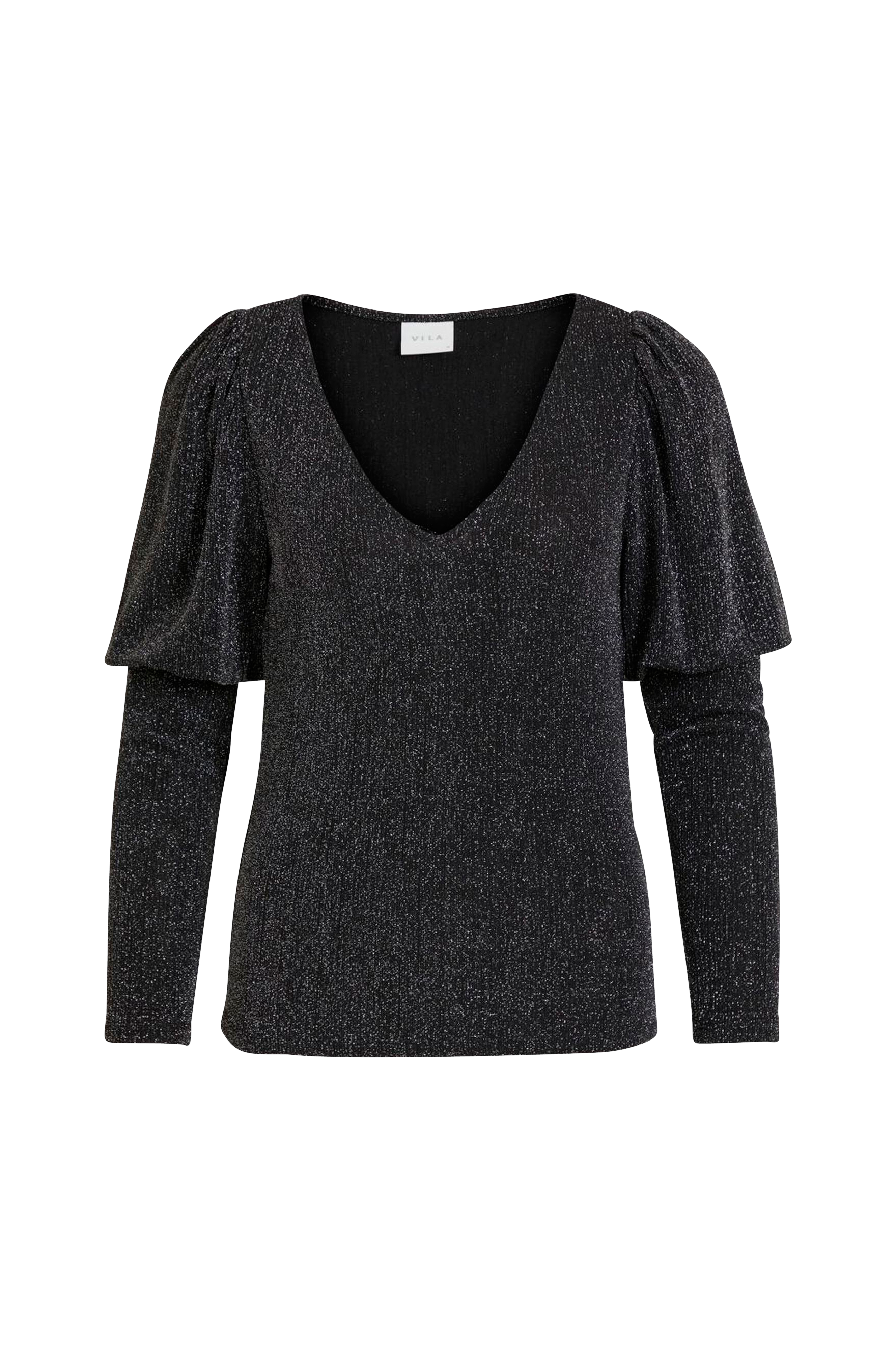 Topp viShinni Glitter V-neck L/S Top fra Vila i glitrende trikot. Smal modell med V-utringning foran og lange puffermer.